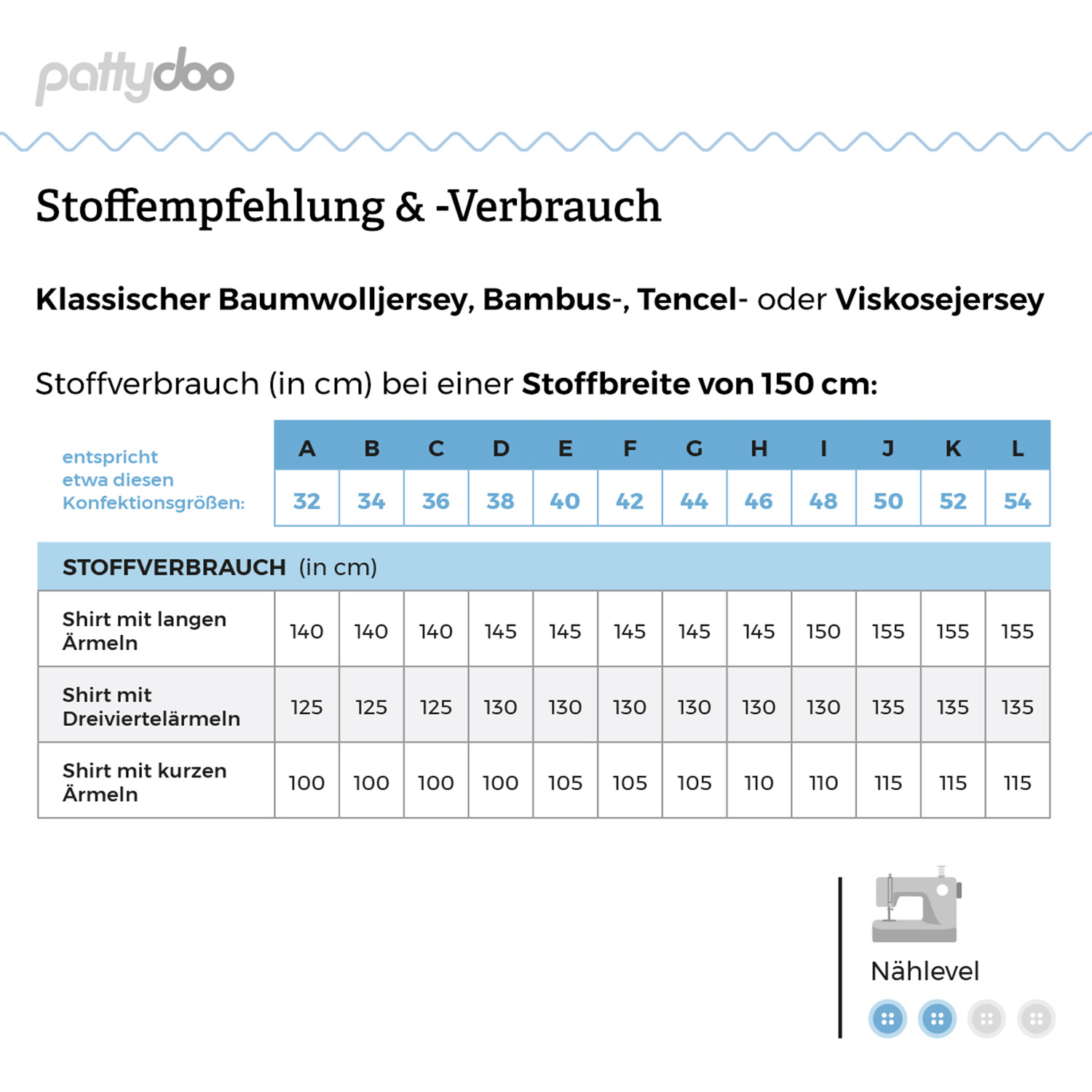 Die ausführliche, kostenlose Videoanleitung führt dich Schritt für Schritt vom Zuschnitt bis zum letzten Stich, sodass auch Nähanfänger entspannt loslegen können. Auf dem übersichtlichen Schnittbogen findest du alle Größen von 32 bis 54, ergänzt durch ein Booklet mit Maßtabellen, Zuschnittplänen und praktischen Hinweisen zur individuellen Anpassung.