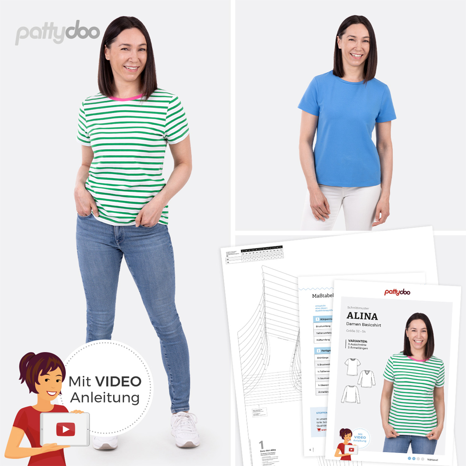Mit diesem Basic-Shirt-Schnittmuster nähst du dir im Nu deinen neuen Alltagsliebling. Auf dem Produktbild erkennst du, wie schön der weiche Jersey fällt: Die klare, schnörkellose Linienführung umspielt sanft die Figur und wirkt je nach Styling sportlich-lässig oder dezent feminin.