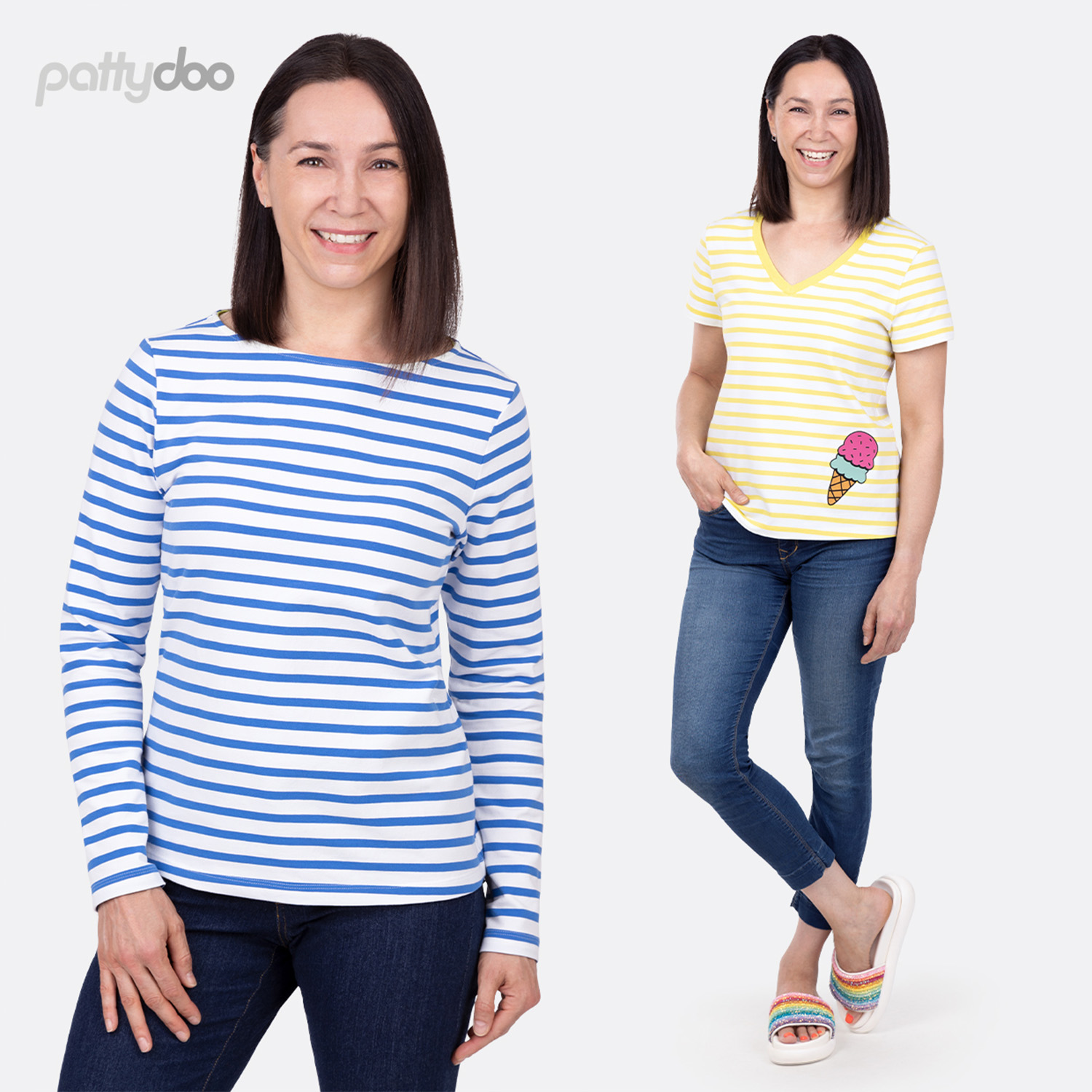 Ob uni, gestreift, dezent gemustert oder in deiner persönlichen Lieblingsfarbe: Mit diesem Basic-Shirt-Schnittmuster zauberst du dir immer wieder neue, vielseitig kombinierbare Oberteile, die deine selbstgenähte Garderobe perfekt ergänzen.