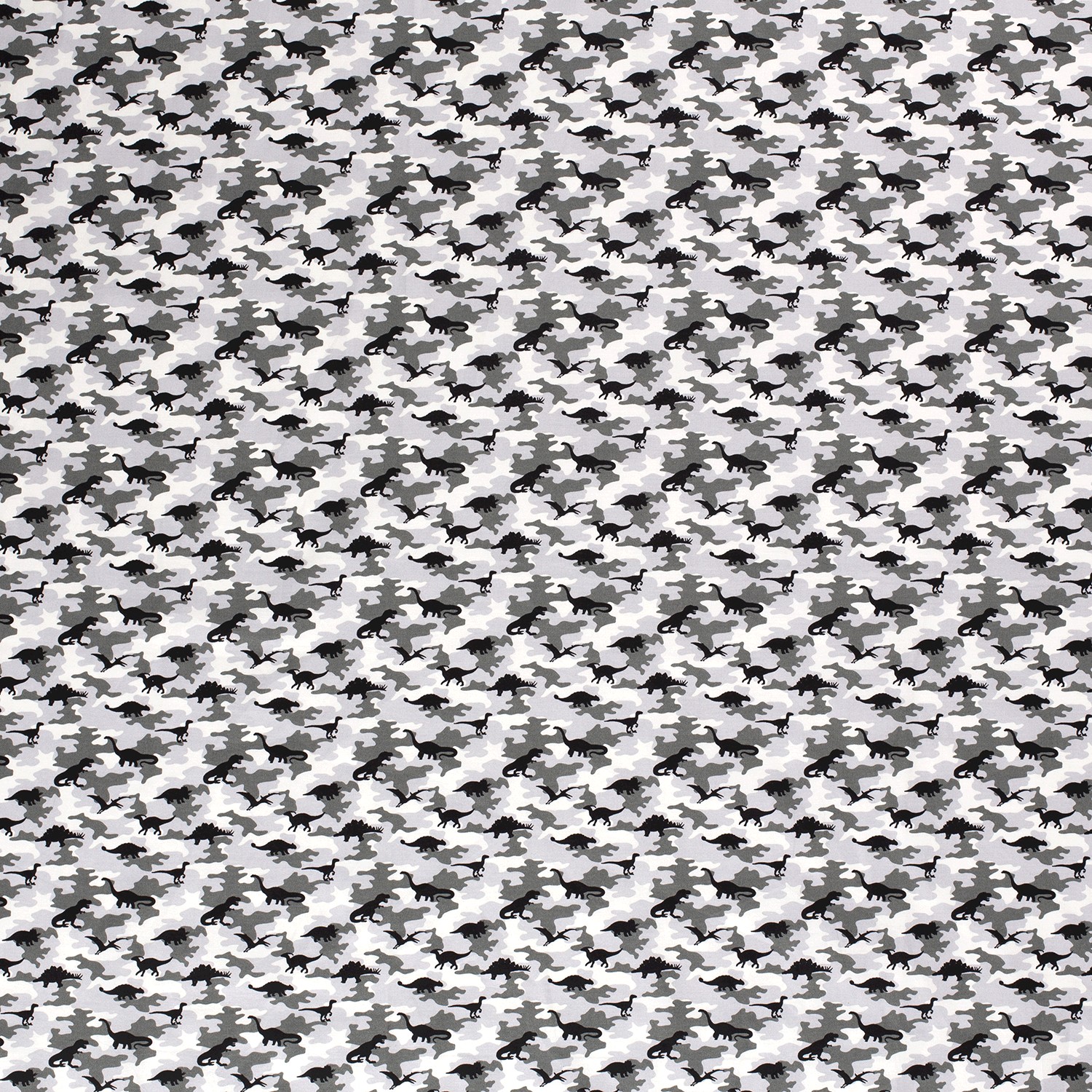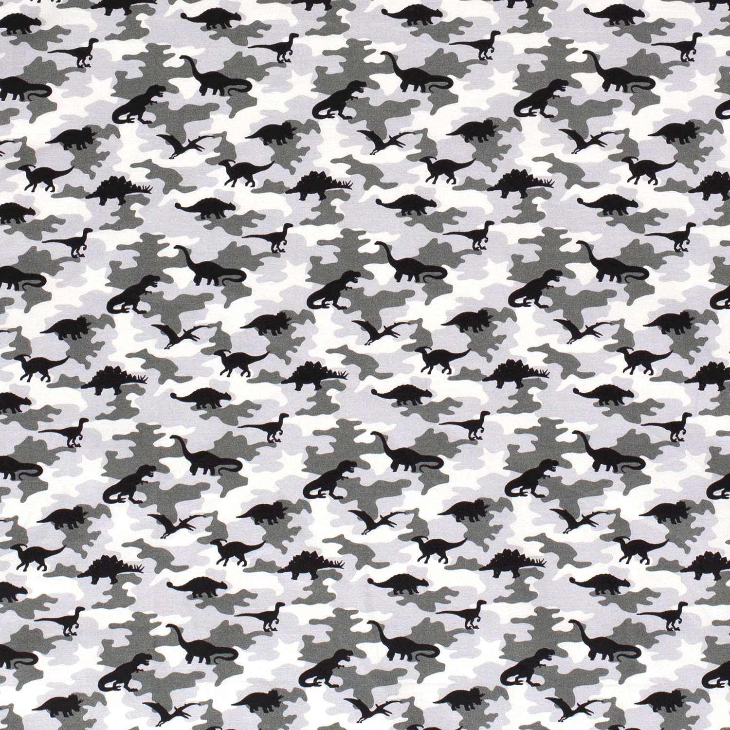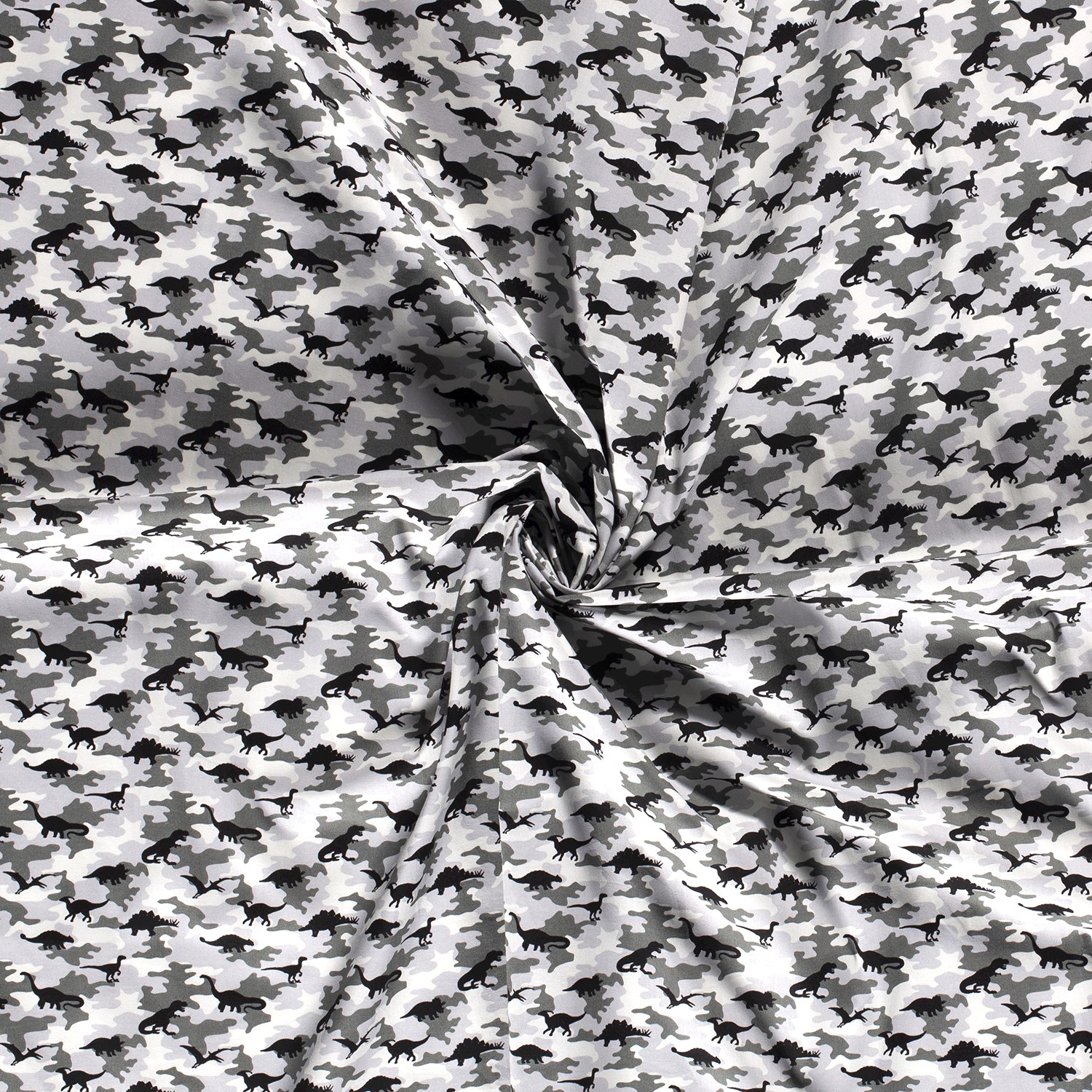 Dieser Baumwollstoff kombiniert cooles Camouflage-Design mit einem verspielten Dino-Muster – perfekt für alle kleinen und großen Dino-Fans. Zwischen den typischen Tarnflecken in verschiedenen Grau- und Schwarztönen verstecken sich detailreich gezeichnete Dinosaurier und Flugsaurier, die dem klassischen Bundeswehr-Look eine originelle, kindgerechte Note verleihen.