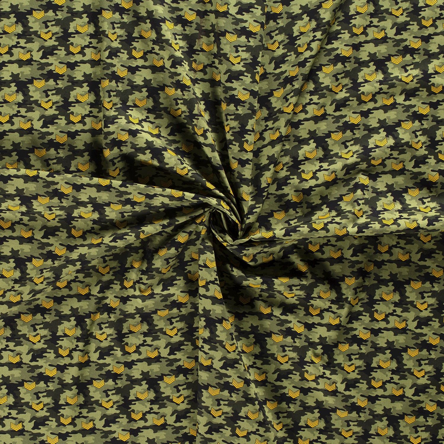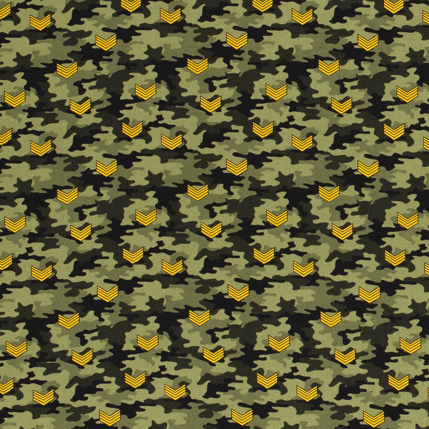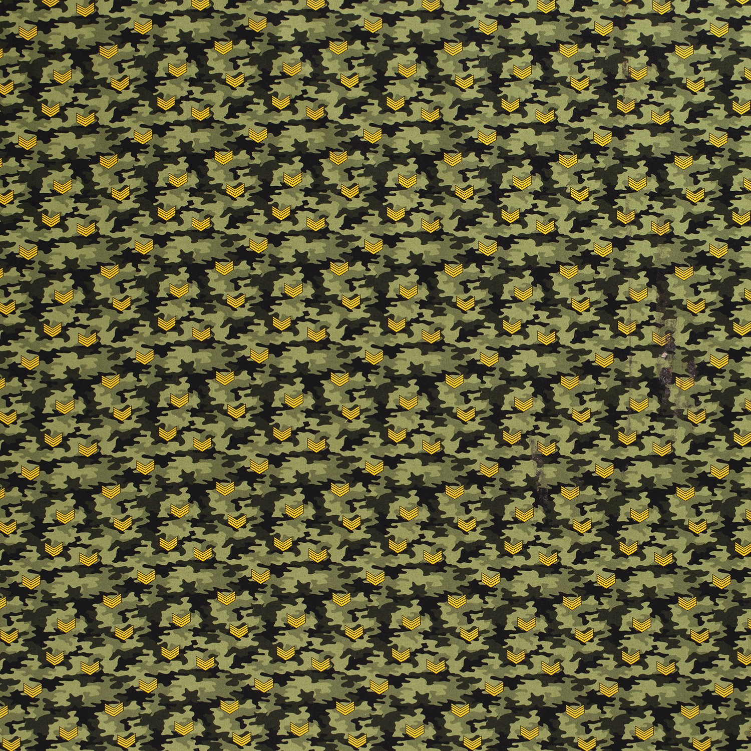 Dieser Camouflage-Stoff in satten Grün- und Olivtönen bringt den typischen Army-Look direkt in dein Nähzimmer. Zwischen den klassischen Tarnflecken sind kleine Abzeichen und Sterne in Beige, Schwarz und dezenten Gelbtönen verteilt – wie auf einer echten Uniform, nur als stylisches Allover-Design.