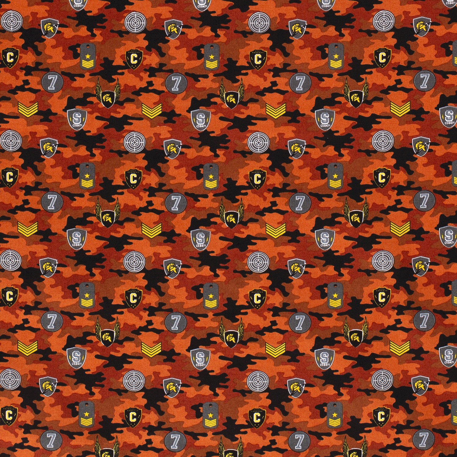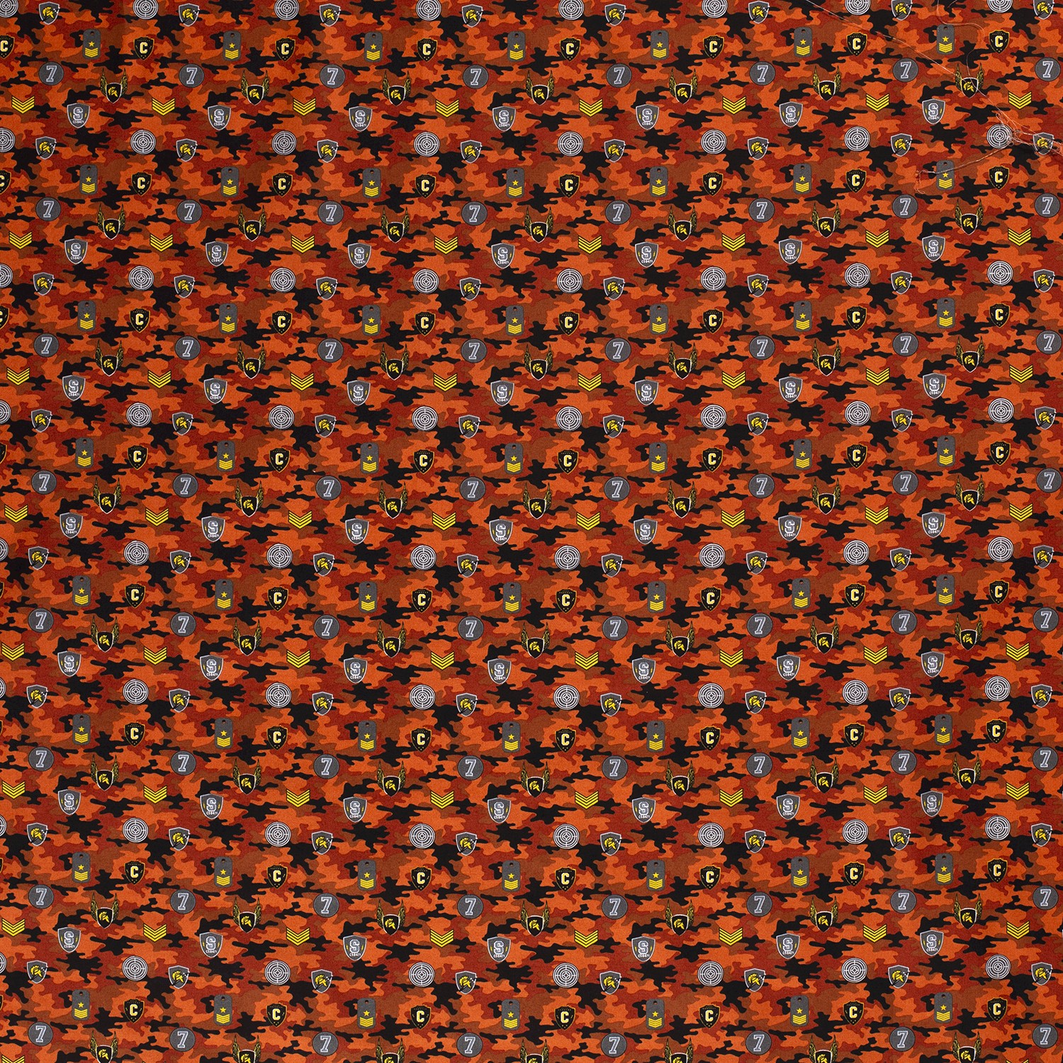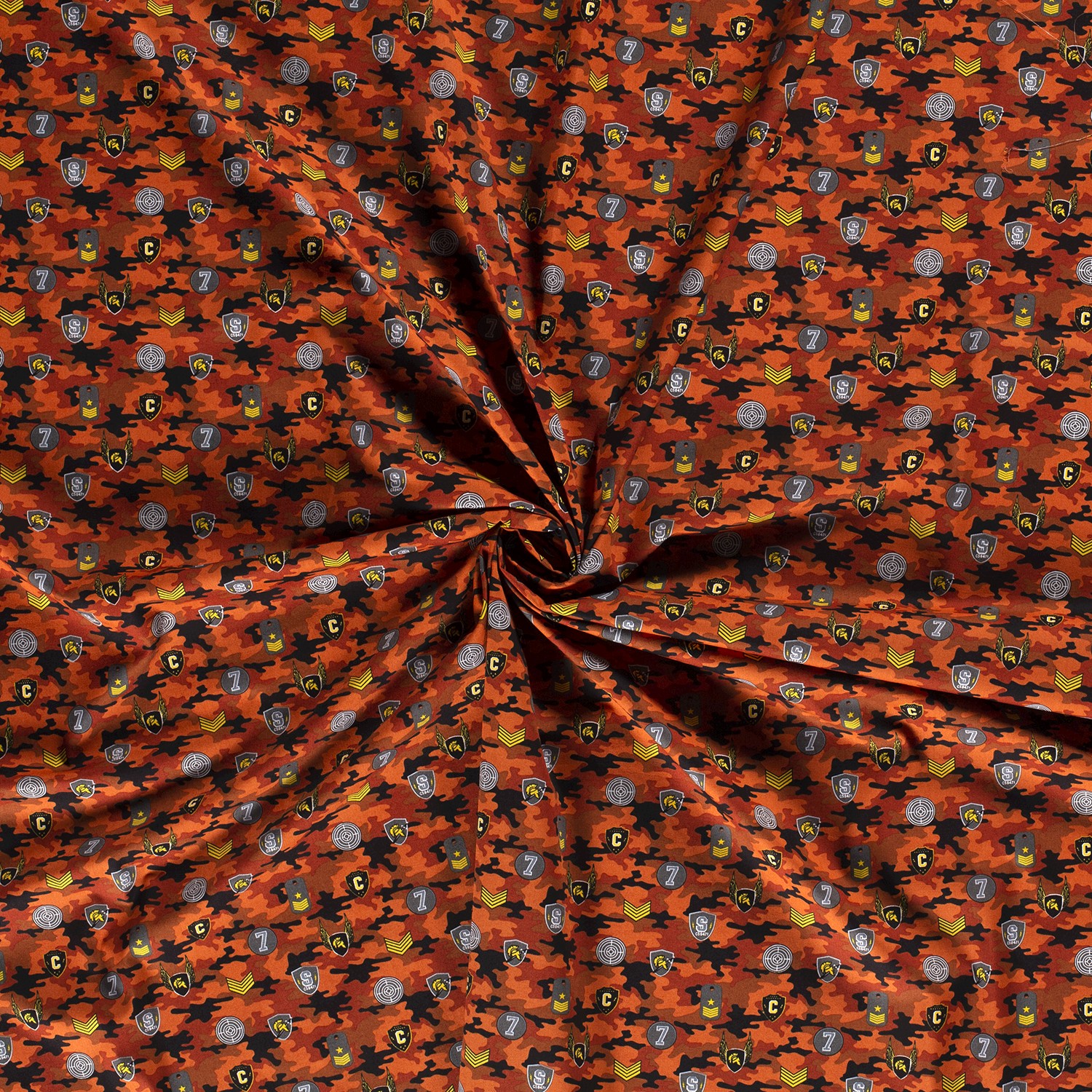 Ein Stoff wie ein Abenteuer in der Luft: Auf lebhaft orangem Hintergrund ziehen sich markante Camouflage-Flächen in warmen Braun- und Beigetönen sowie sattem Schwarz über den Stoff. Dazwischen setzen detailreiche Pilotenabzeichen, Sterne und Embleme in kräftigem Schwarz und leuchtendem Orange spannende Akzente – wie auf einer Fliegerjacke voller Ehrenabzeichen.