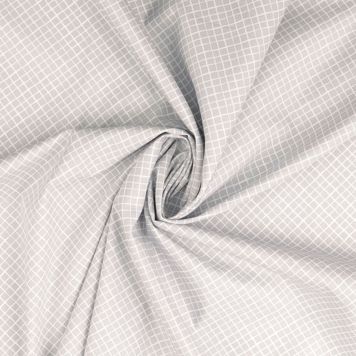 Ein moderner Klassiker für deine Nähprojekte: Auf einem sanft hellgrauen Hintergrund verläuft ein feines Netz aus zarten, weißen Linien, die ein stilvolles Rautenmuster bilden. Das dezente, geometrische Design wirkt klar und aufgeräumt, ohne aufdringlich zu sein – perfekt für alle, die es zeitlos, modern und vielseitig kombinierbar mögen.