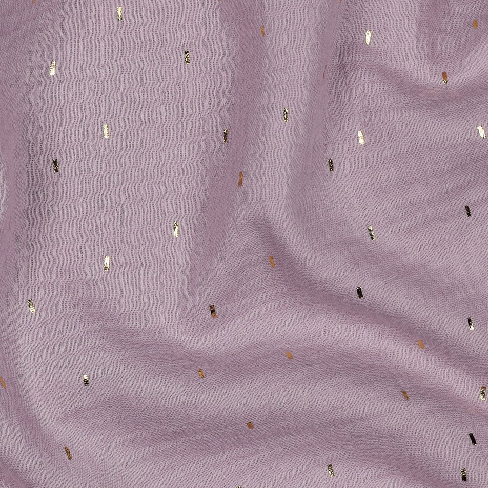 Zarter Musselin in einem traumhaften Altflieder-Ton, veredelt mit feinen, gold glänzenden Ministreichen – dieser Stoff verbindet lässige Natürlichkeit mit einem Hauch von Glamour. Die unregelmäßig gesetzten, schmalen Goldstreifen schimmern je nach Lichteinfall und verleihen dem weichen, leicht gekreppten Gewebe eine edle, verspielte Note.