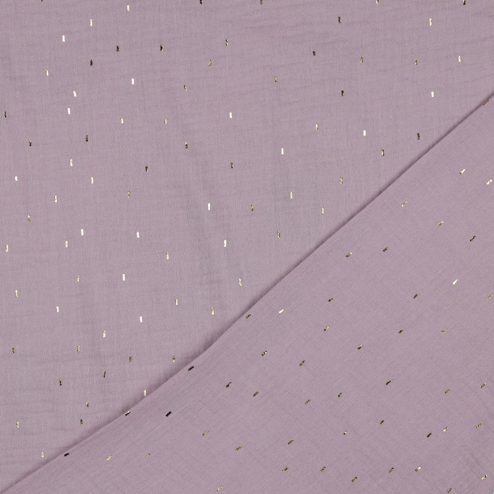 Der sanfte Fliederton wirkt ruhig und harmonisch, während der Foilprint für einen modernen, stilvollen Akzent sorgt. Ideal für luftige Blusen, Tücher, Kinderkleidung, Decken, Schals oder Accessoires, die ein bisschen Besonderes ausstrahlen dürfen. Ob für festliche Anlässe oder als Hingucker im Alltag – dieser Musselin macht jedes Nähprojekt zu einem kleinen Lieblingsstück.