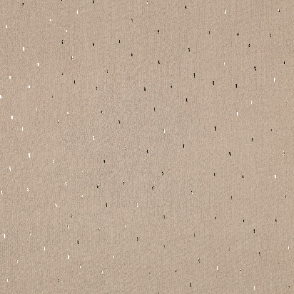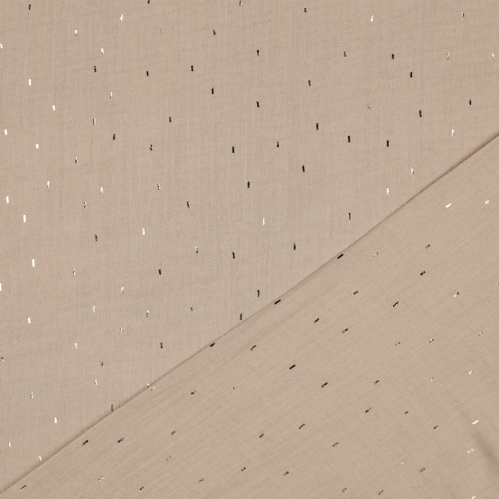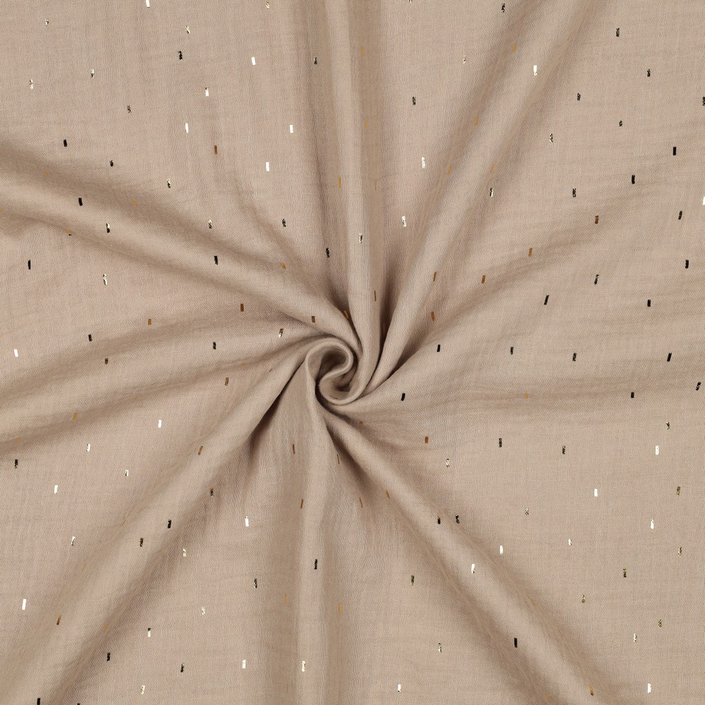 Zarter Musselin in edler Optik: Auf einem warmen, beigefarbenen Hintergrund verteilen sich feine, unregelmäßige Ministreifen in schimmerndem Gold-Foilprint. Das dezente, dennoch wirkungsvolle Design erinnert an sanfte Sonnenstrahlen auf Sand und verleiht jedem Nähprojekt eine stilvolle, moderne Note.