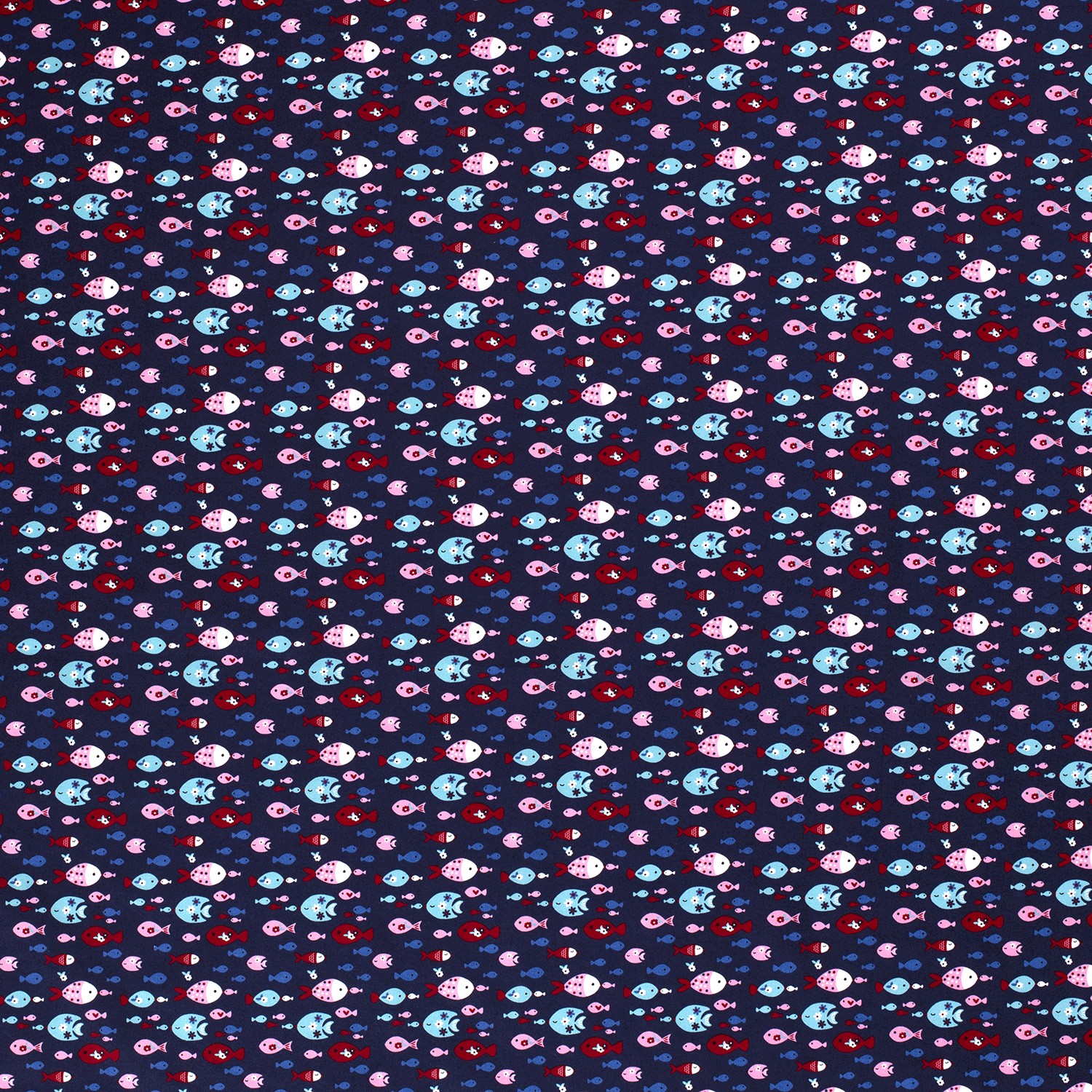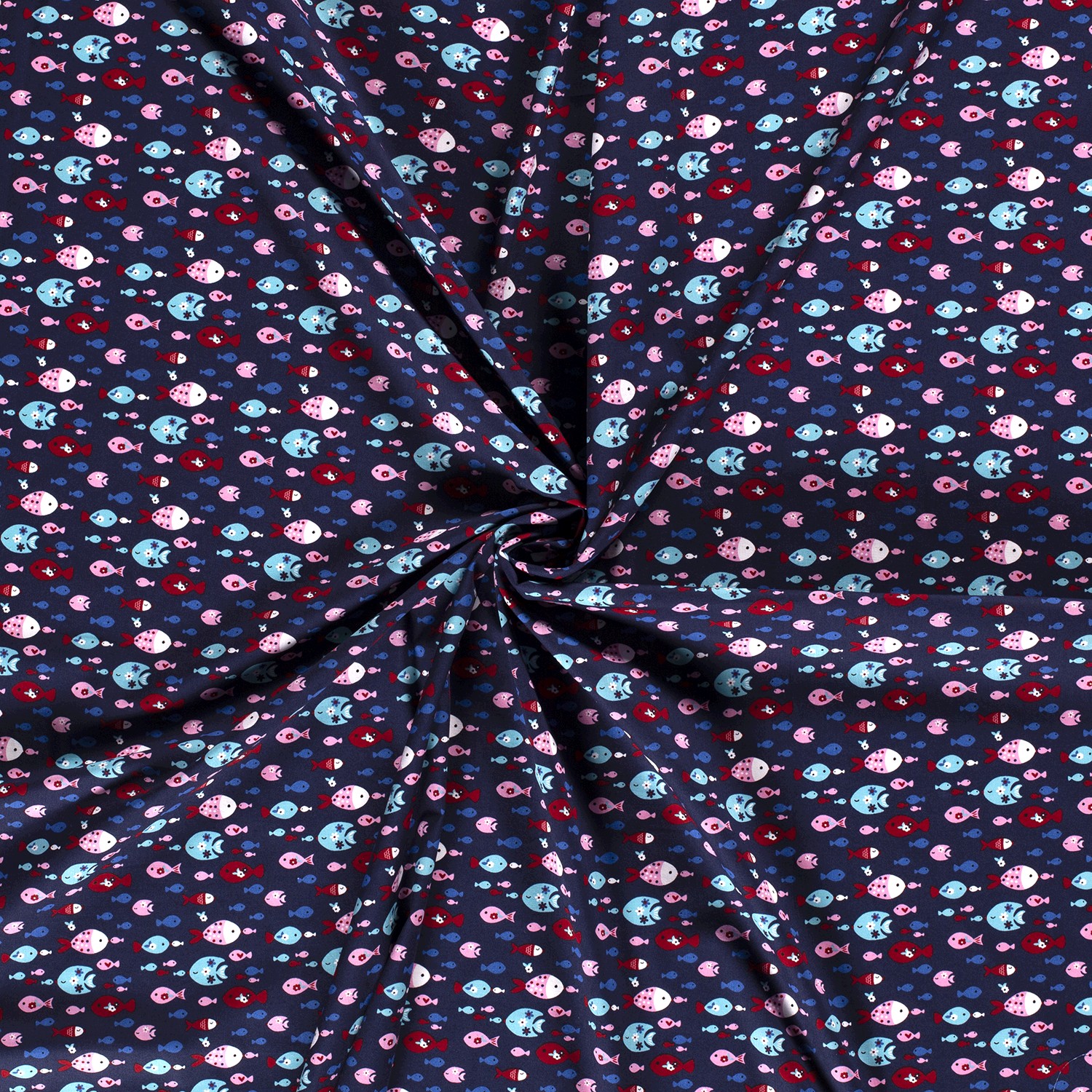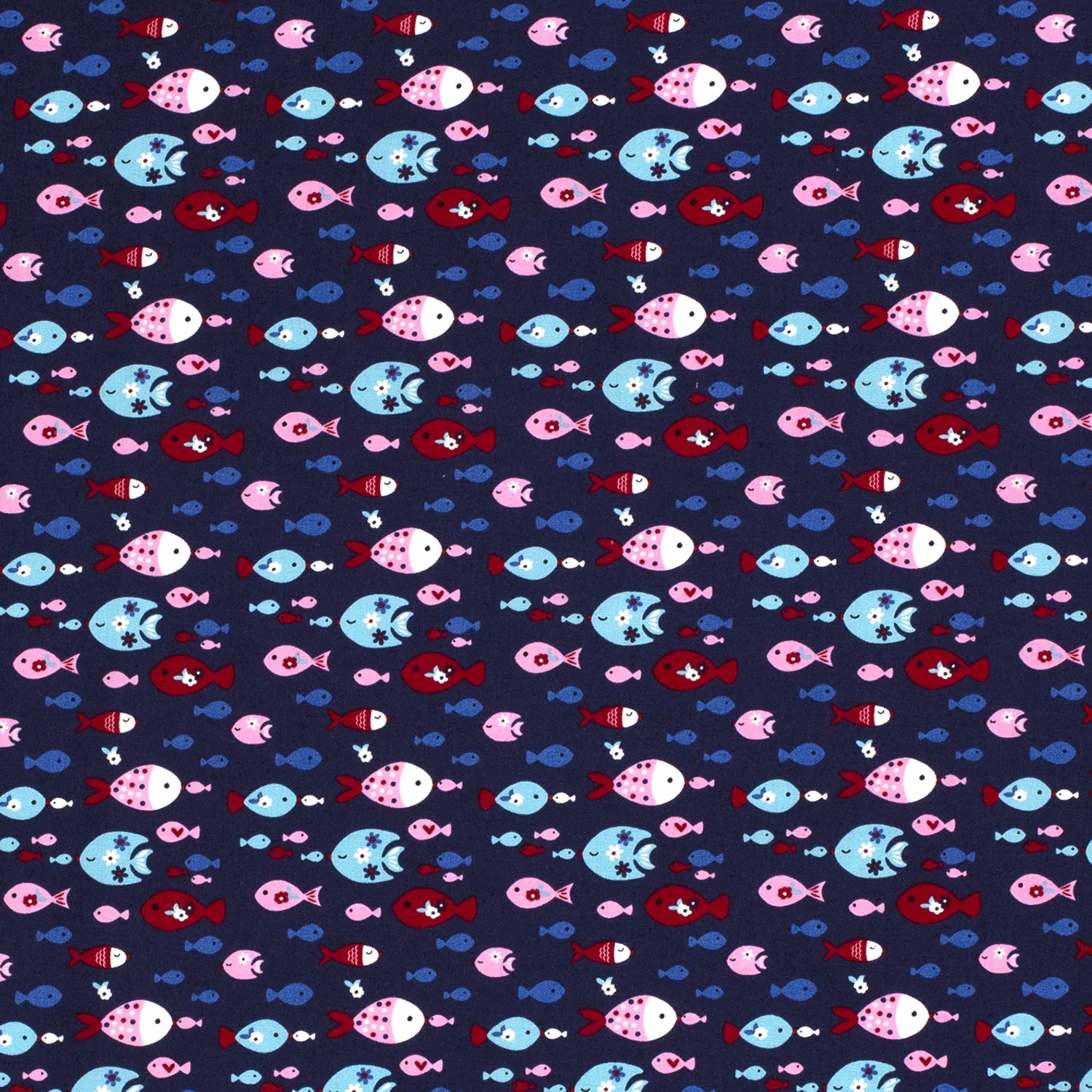 Auf diesem zauberhaften Baumwollstoff tummeln sich kleine, liebevoll gezeichnete Fische und zarte Blüten auf tiefdunkelblauem Hintergrund – wie ein Blick in eine geheimnisvolle Unterwasserwelt. Die fröhlichen Meerestiere in hellen, freundlichen Farben und die feinen Blümchen sorgen für einen verspielten, maritimen Look, der sofort gute Laune macht.
