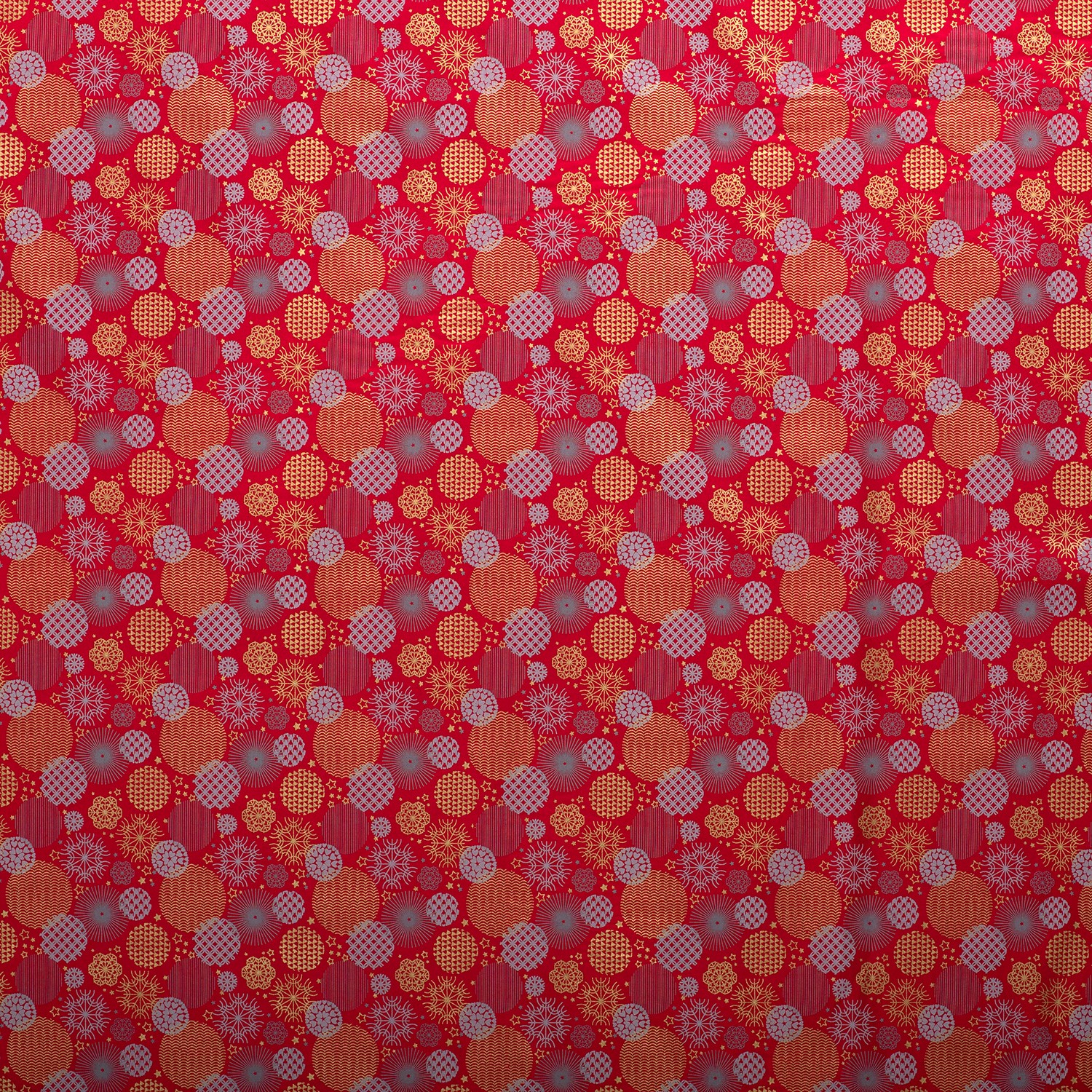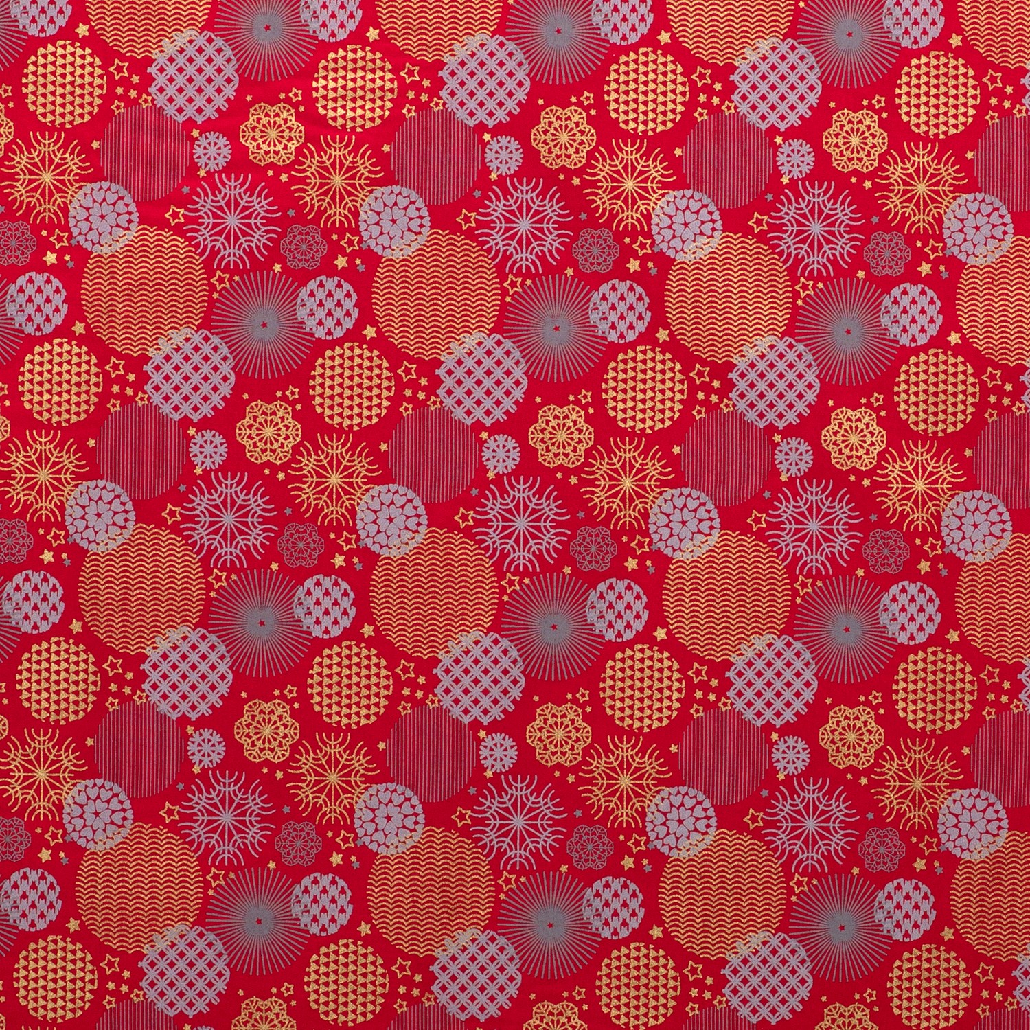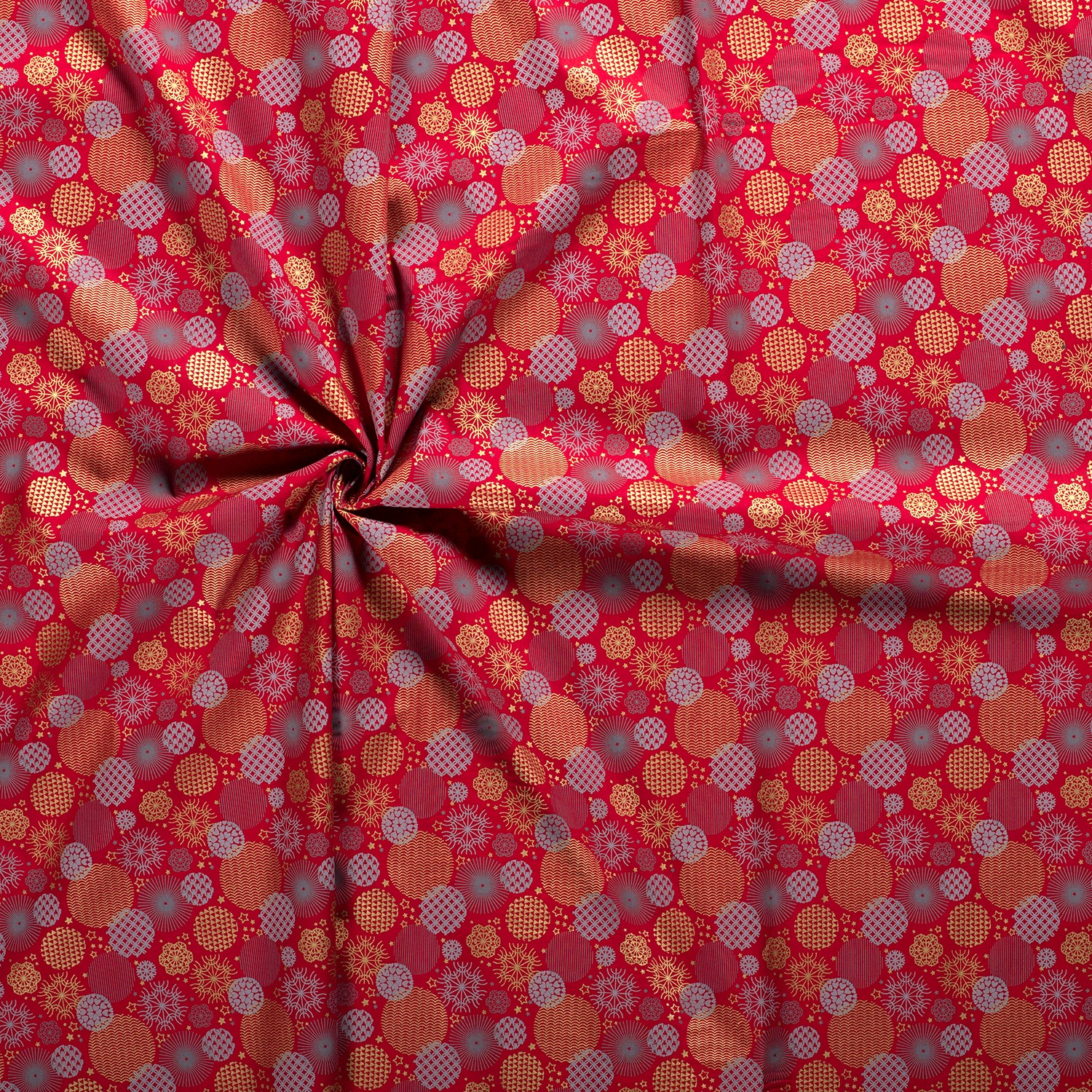 Festlicher kann Weihnachten kaum aussehen: Auf leuchtend rotem Hintergrund tummeln sich elegante Christbaumkugeln in Gold, kunstvoll verziert mit Sternen, Herzen, Schneeflocken und zarten Ornamenten. Der edle Golddruck schimmert je nach Lichteinfall und verleiht dem Stoff eine besonders stimmungsvolle, beinahe märchenhafte Ausstrahlung.