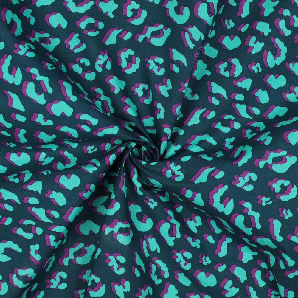 Diese beschichtete Baumwolle bringt den wilden Look des Leopardenmusters in einer modernen, stilvollen Variante in dein Nähprojekt. Auf einem tiefen Petrol-Ton tanzen unzählige Leo-Flecken in warmen Braun- und Beigenuancen, fein konturiert mit dunklen Akzenten – ein echter Hingucker, der gleichzeitig edel und lässig wirkt.