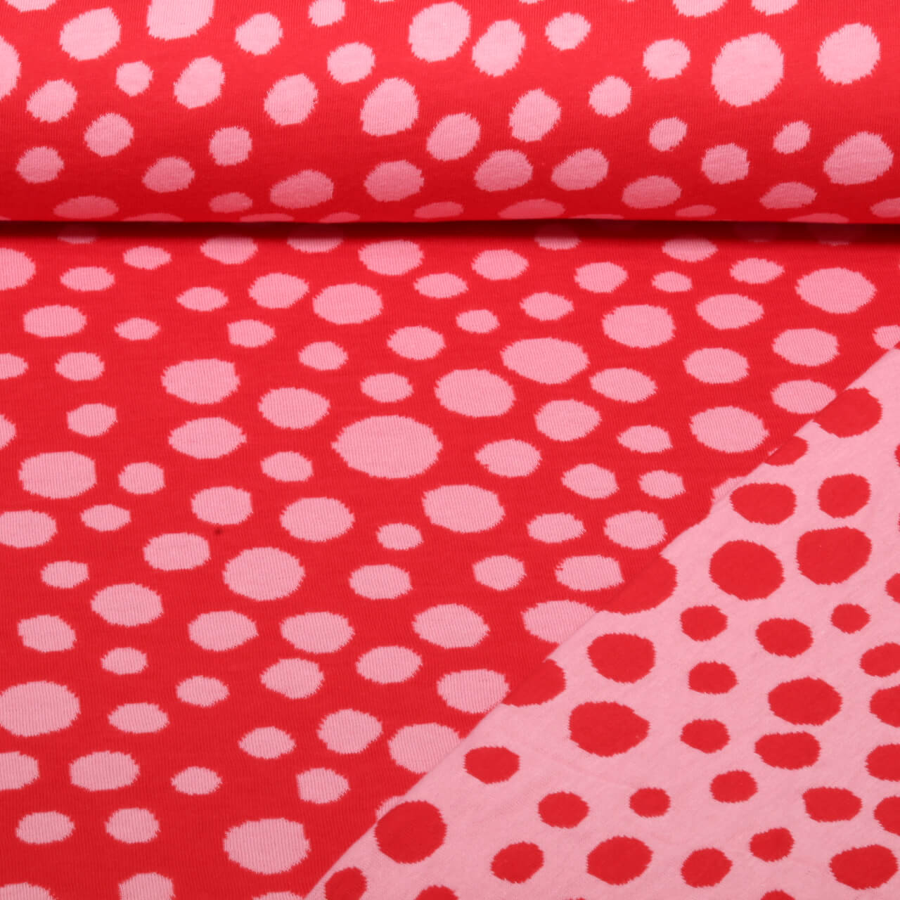 Ein Stoff zum Verlieben: Dieser weiche Bio Jacquard Jersey begeistert in einem leuchtenden Rotton mit modernem Punktdesign, das an kleine Herzen erinnert. Als praktischer Doubleface-Stoff zeigt er sich auf beiden Seiten von seiner schönsten Seite – mal etwas ruhiger, mal mit mehr Kontrast – und eröffnet dir so gleich zwei Looks in einem.