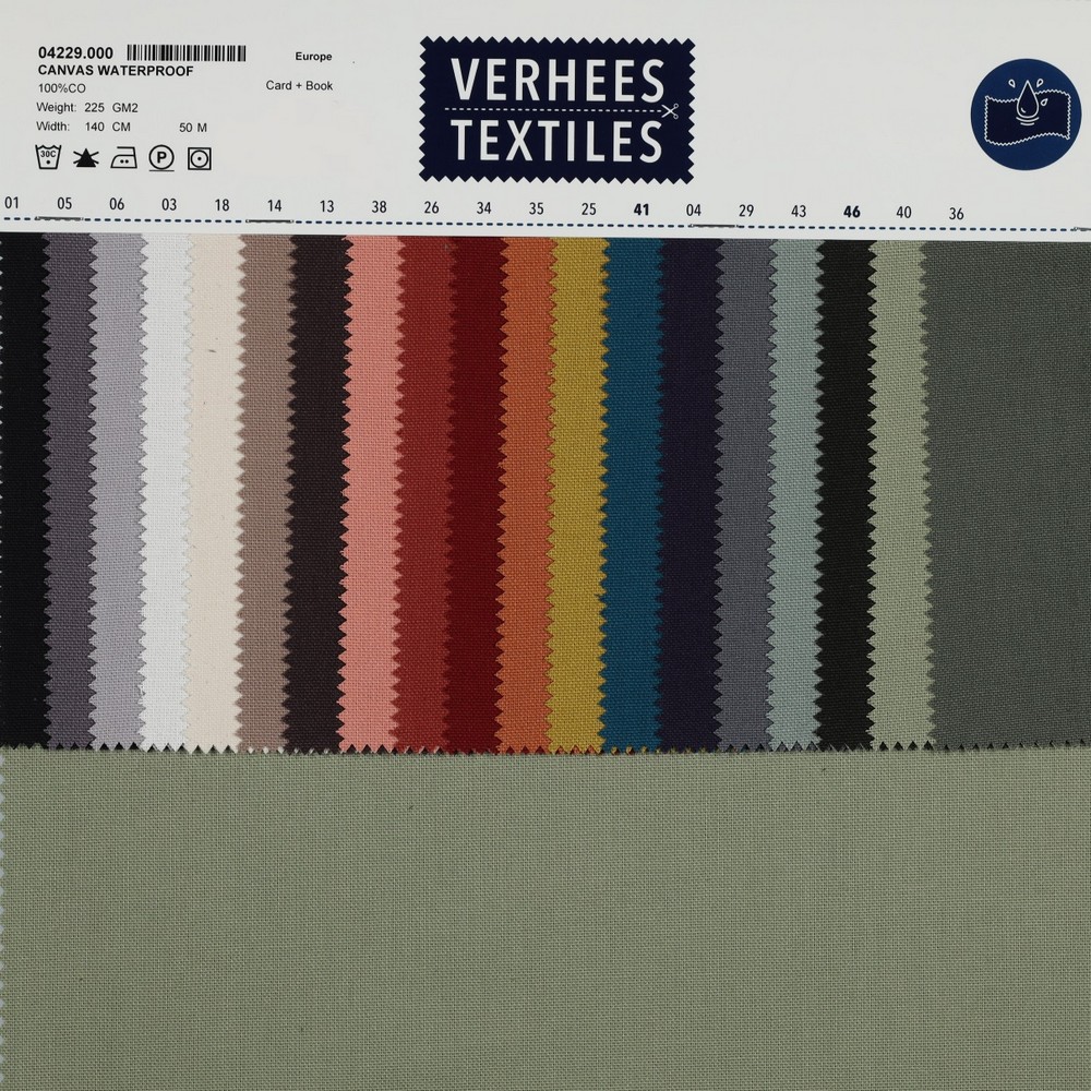 Dieser wasserabweisende Canvas präsentiert sich in wunderschönen, garngefärbten Uni-Tönen, die sofort Lust aufs Nähen machen. Auf dem Bild siehst Du die edle, fein strukturierte Oberfläche in sattem Dunkelblau, elegantem Grau, natürlichem Olivgrün und leuchtendem Orange – jede Farbe für sich ein stilvoller Hingucker. Die feinen Wassertropfen perlen sichtbar von der Oberfläche ab und zeigen, wie ideal dieser Stoff für Projekte ist, die auch mal einen Regenschauer abbekommen dürfen.