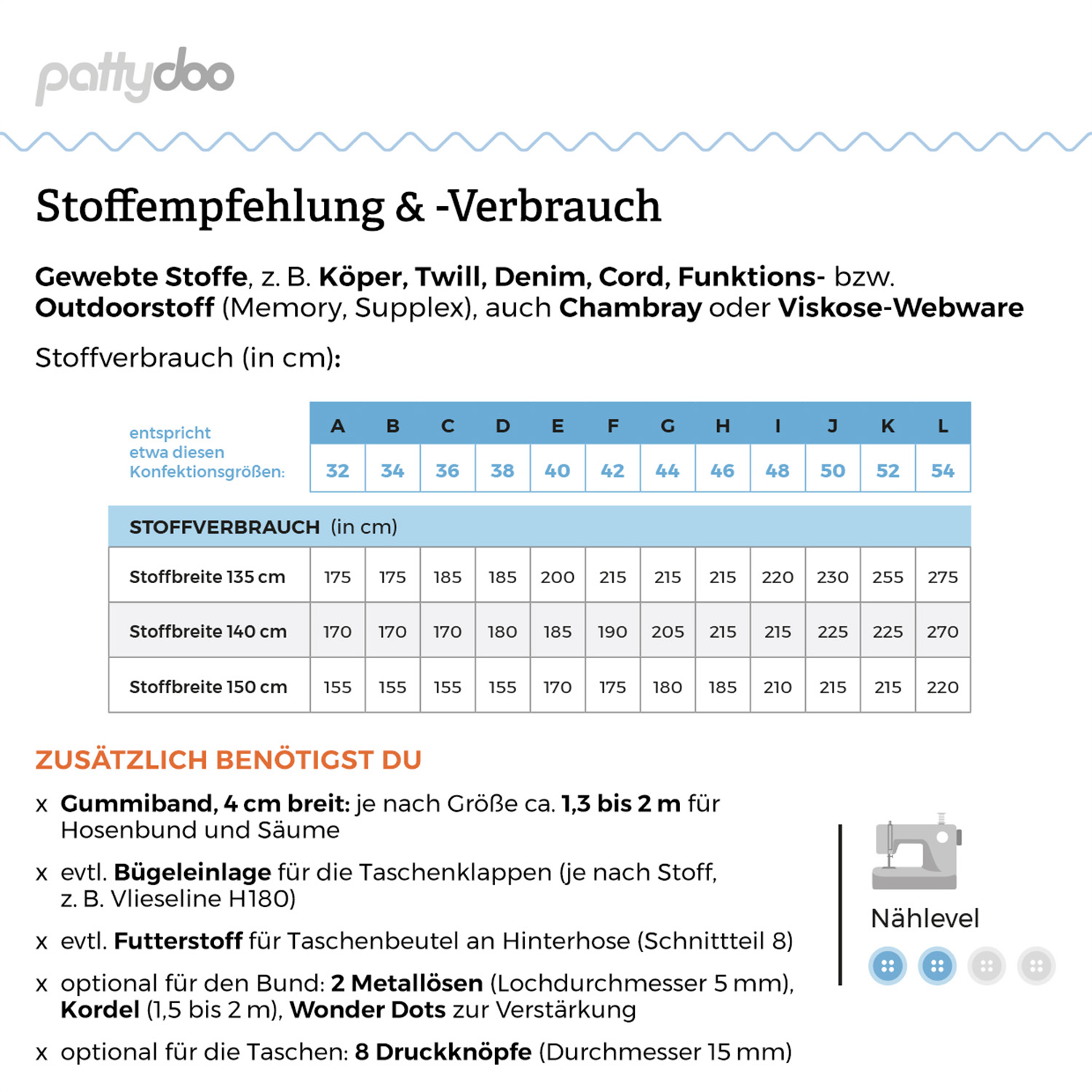 Für den perfekten Look wählst du aus einer großen Bandbreite an gewebten Stoffen – von robust und strukturiert bis weich fallend und etwas eleganter. Besonders schön wirken z. B. Stoffe in Köper- oder Twill-Bindung, aber auch Materialien mit lässiger Denim-Optik. Für eine leichtere, luftige Variante kannst du ebenso zu feinerem Chambray greifen. So entsteht genau die Hose, die zu deinem Stil und deinem Alltag passt.