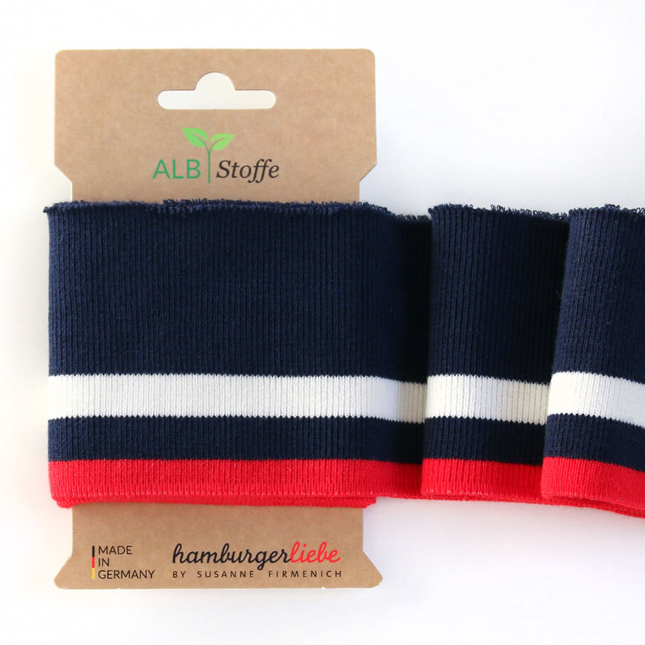 Dieser Cuff Me College Strick bringt sofort sportlichen College-Charme in deine Nähprojekte. Die kräftigen Blockstreifen in sattem Navy, klarem Weiß und leuchtendem Rot erinnern an klassische Varsity-Jacken und geben jedem Teil einen coolen, lässigen Look.