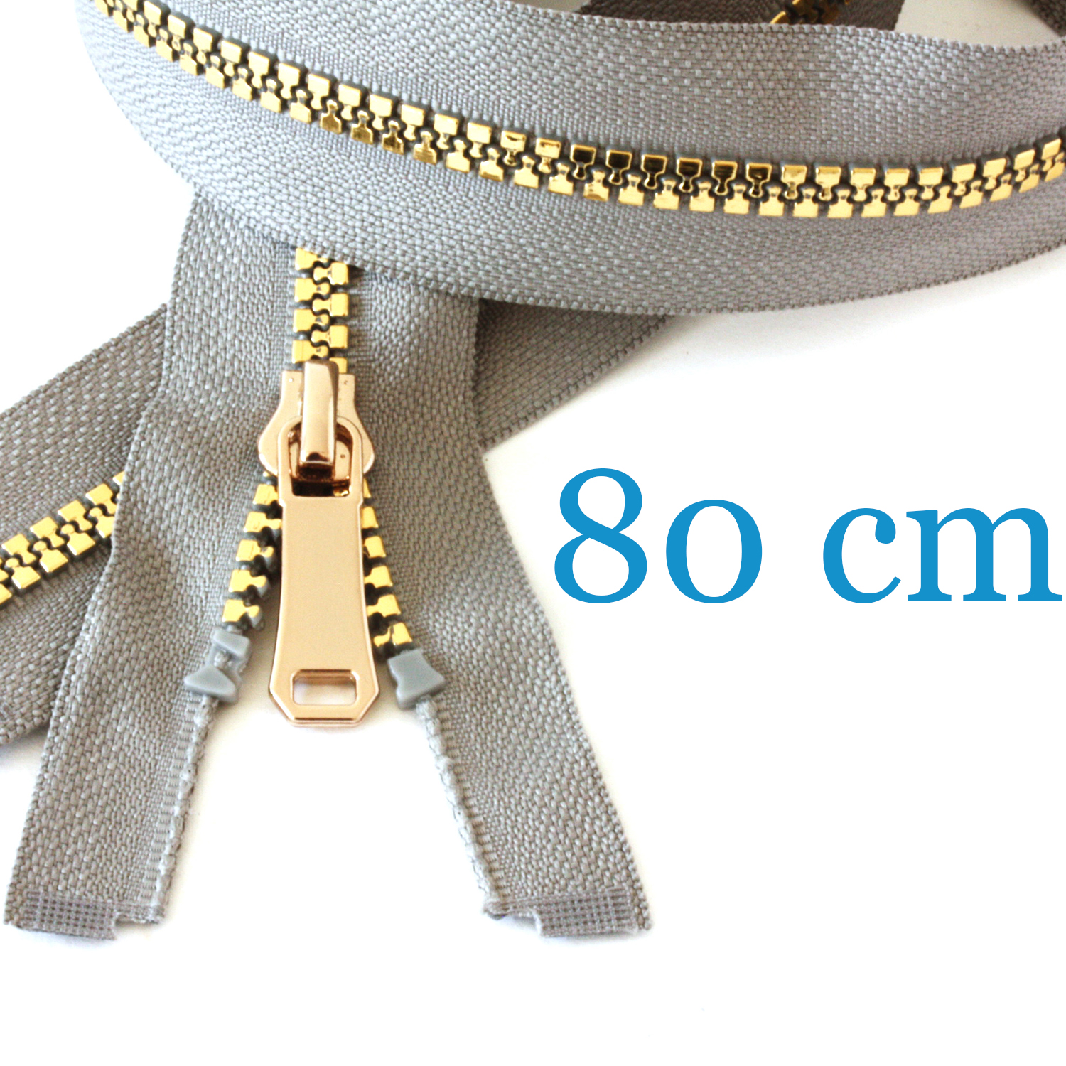 Dieser teilbare Jackenreißverschluss in edlem Hellgrau mit gold-metallisierter Raupe ist ein echter Hingucker für Deine Nähprojekte. Das warme Gold der Zähnchen harmoniert perfekt mit dem dezenten, grauen Band und dem glänzenden Zipper – so verleihst Du Jacken, Cardigans, Blousons oder Sweatjacken im Handumdrehen einen hochwertigen, modernen Look.
