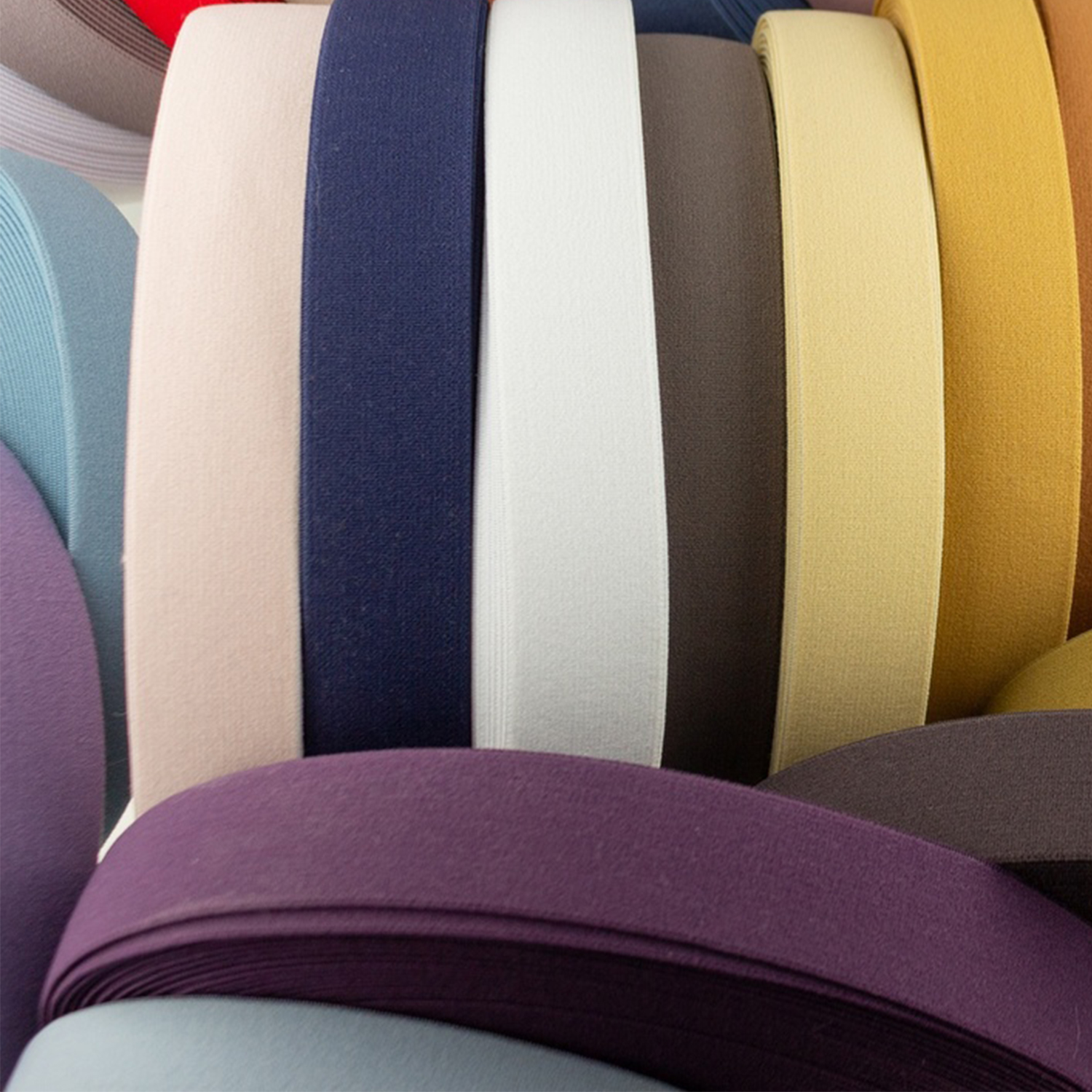 Das elastische Band ist beidseitig verwendbar und überzeugt durch seine gleichmäßige, glatte Struktur. Auf dem Produktbild siehst du eine große Auswahl an schönen Uni-Farben – von sanften Pastelltönen wie Rosé, Creme und Hellblau über dezente Klassiker wie Weiß, Beige, Grau und Navy bis hin zu satten, ausdrucksstarken Nuancen wie kräftigem Rot und tiefem Violett. So findest du für jedes Projekt die passende Farbe – ob Ton in Ton oder als bewusster Kontrast.