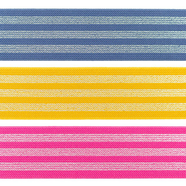Du kannst zwischen frischem Blau, sonnigem Gelb oder leuchtendem Pink wählen – jeweils kombiniert mit dezenten, silbrig schimmernden Streifen. Perfekt geeignet für Hosenbünde, Röcke, Sport- und Freizeitkleidung, Taschen, Accessoires oder als dekorativer Abschluss an Ärmeln und Saumkanten.
