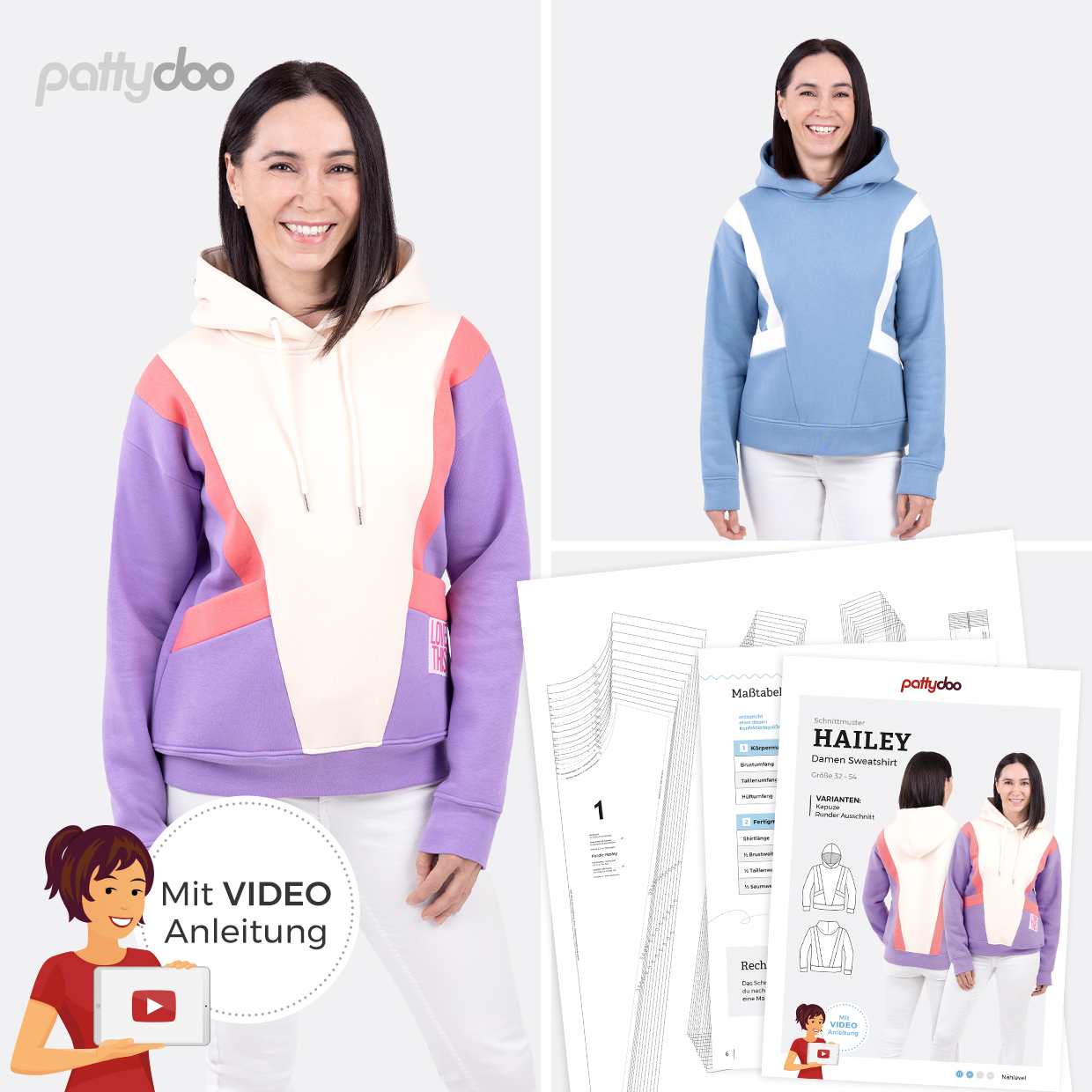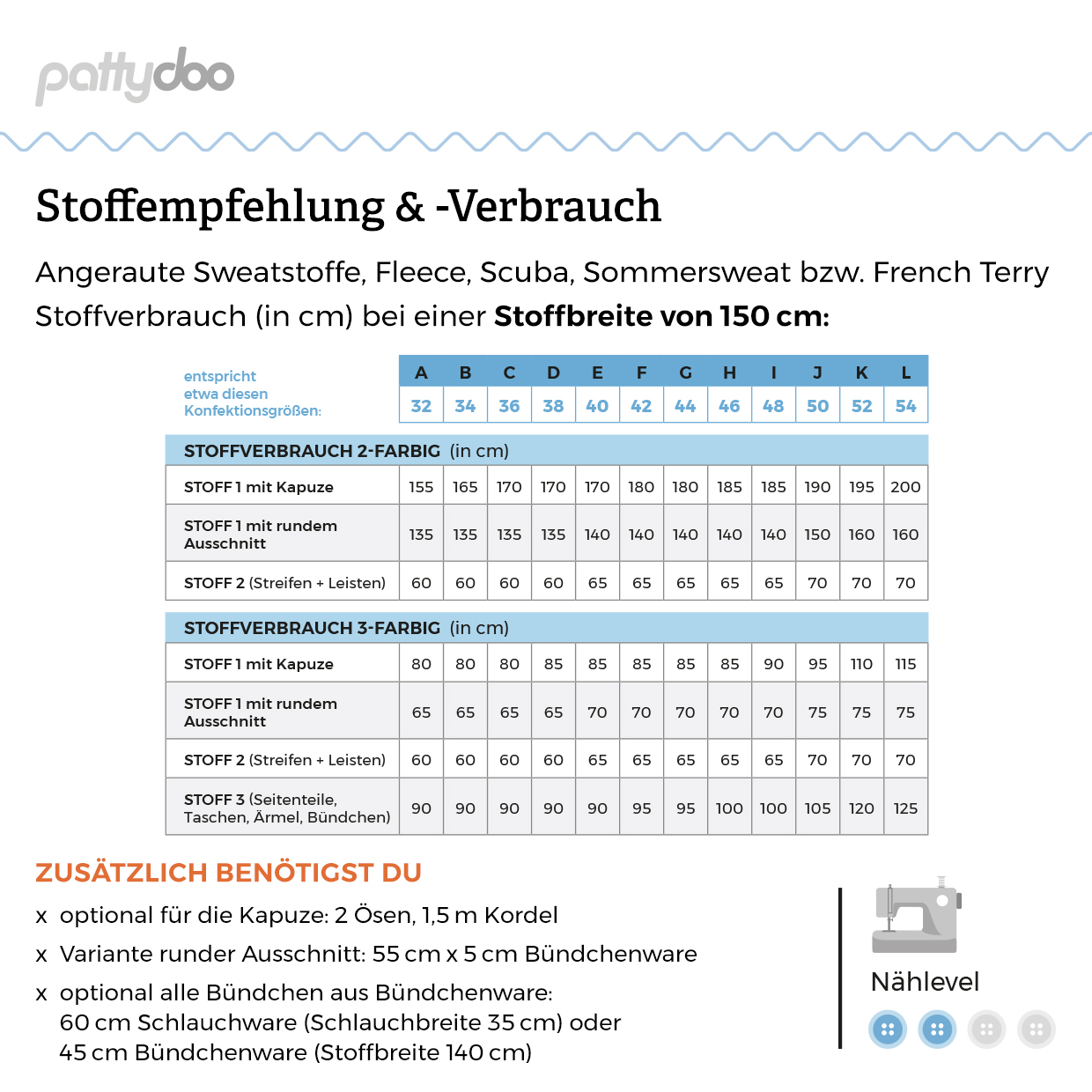 Das Papierschnittmuster enthält alle Schnittteile von Größe 32 bis 54 sowie ein ausführliches Booklet mit Maßtabellen, Zuschnittplänen und Tipps zur Größenanpassung. In der kostenlosen YouTube-Videoanleitung wirst du Schritt für Schritt durch den Nähprozess geführt – ideal auch, wenn du noch nicht so viel Hoodie-Erfahrung hast.