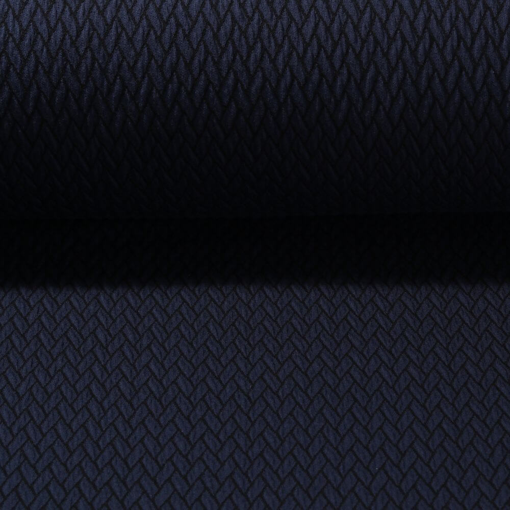Twine Knit verzaubert mit einem feinen, gestrickt anmutenden Minijacquard-Muster in edlem Navy. Die zarten, helleren Linien ziehen sich wie kleine verschlungene Fäden über den dunklen Hintergrund und erinnern an ein liebevoll handgestricktes Lieblingsstück – nur viel leichter und moderner.