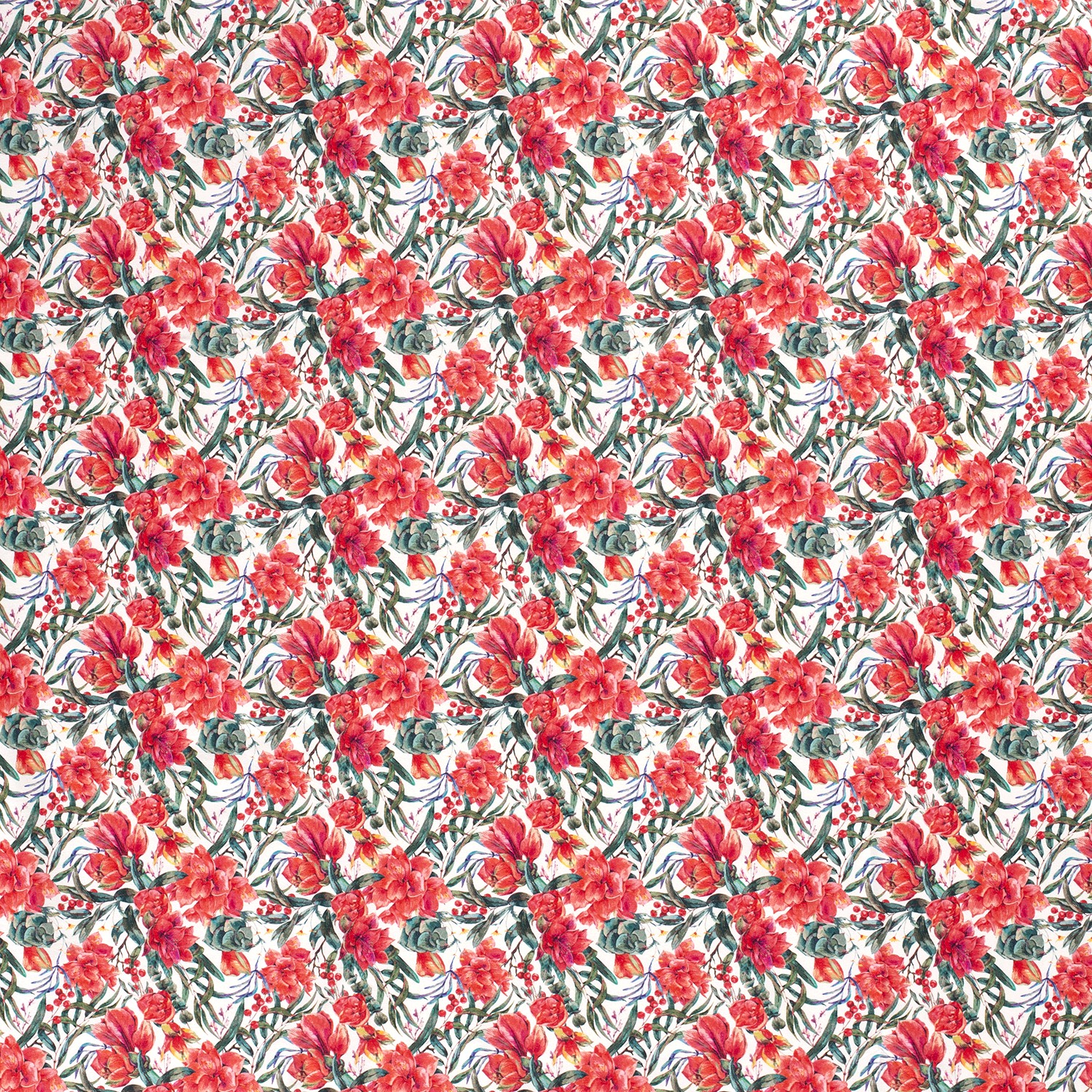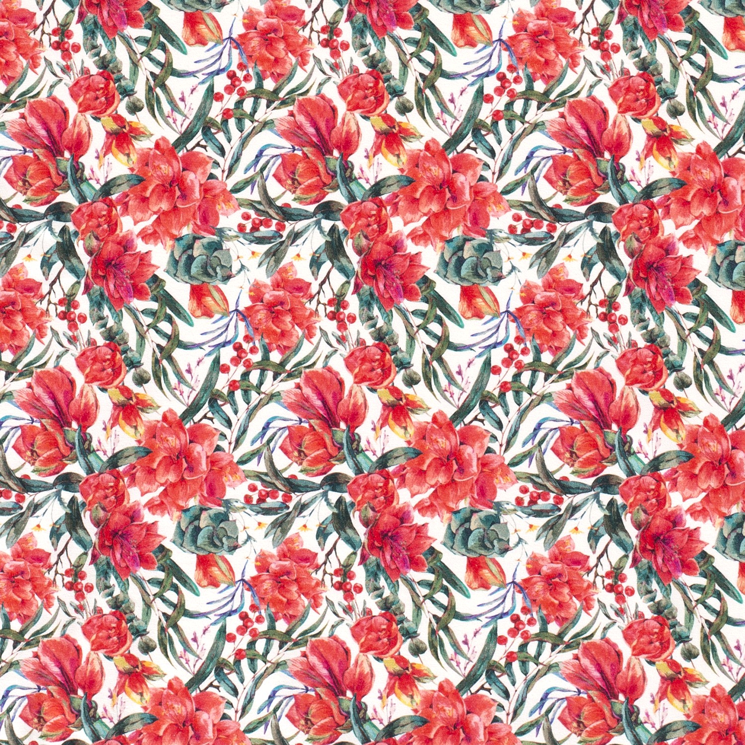 Wie ein zartes Aquarell schmückt dieses romantische Blumengemälde den cremeweißen Hintergrund: feine Blüten in Rosé- und Beerentönen, sanftes Altrosa, warme Senfnuancen und dezente Grüntöne verschmelzen zu einem harmonischen, leicht verträumten Design. Kleine Beeren, filigrane Blätter und detailverliebte Blütenköpfe wirken, als wären sie liebevoll von Hand gemalt – elegant, aber dennoch alltagstauglich.