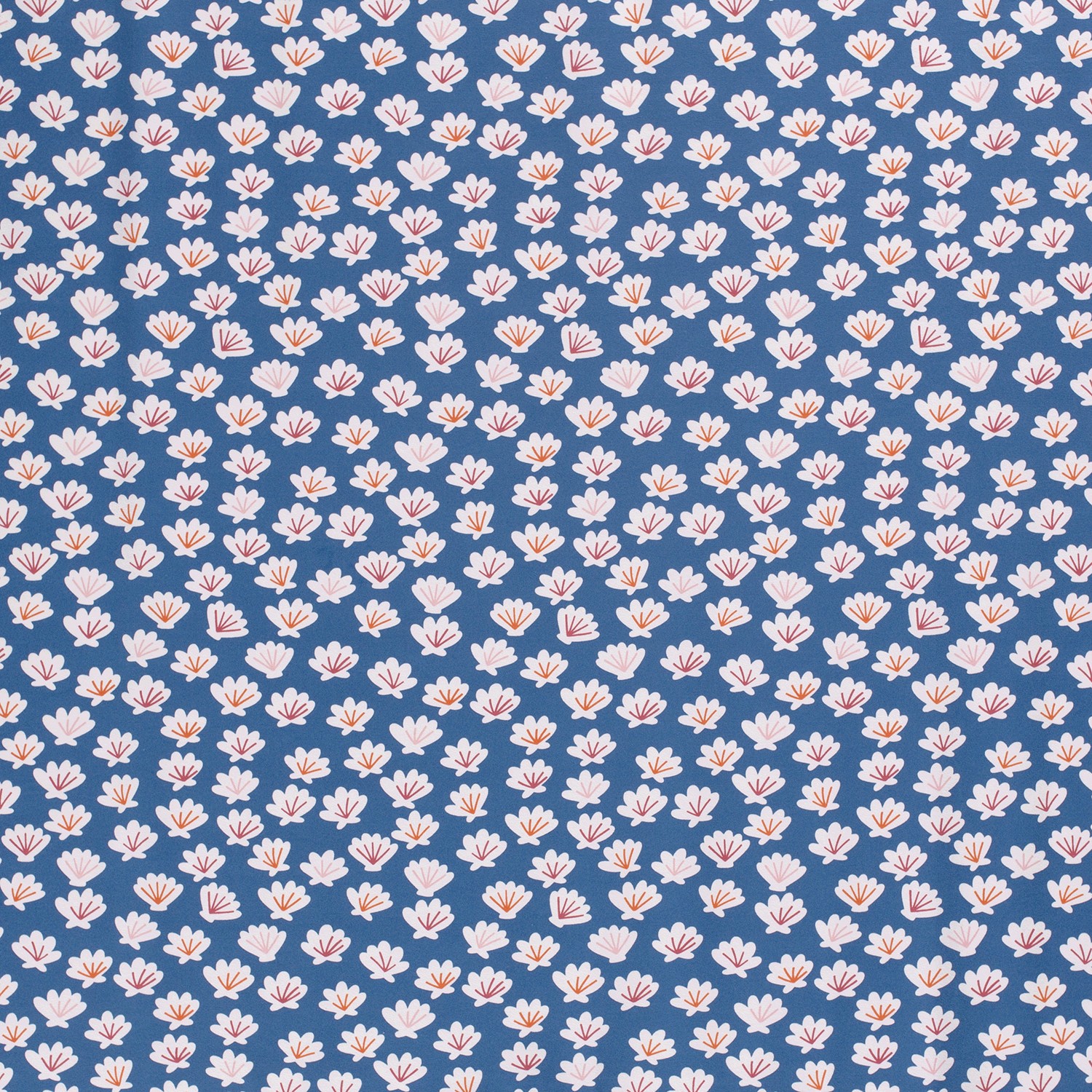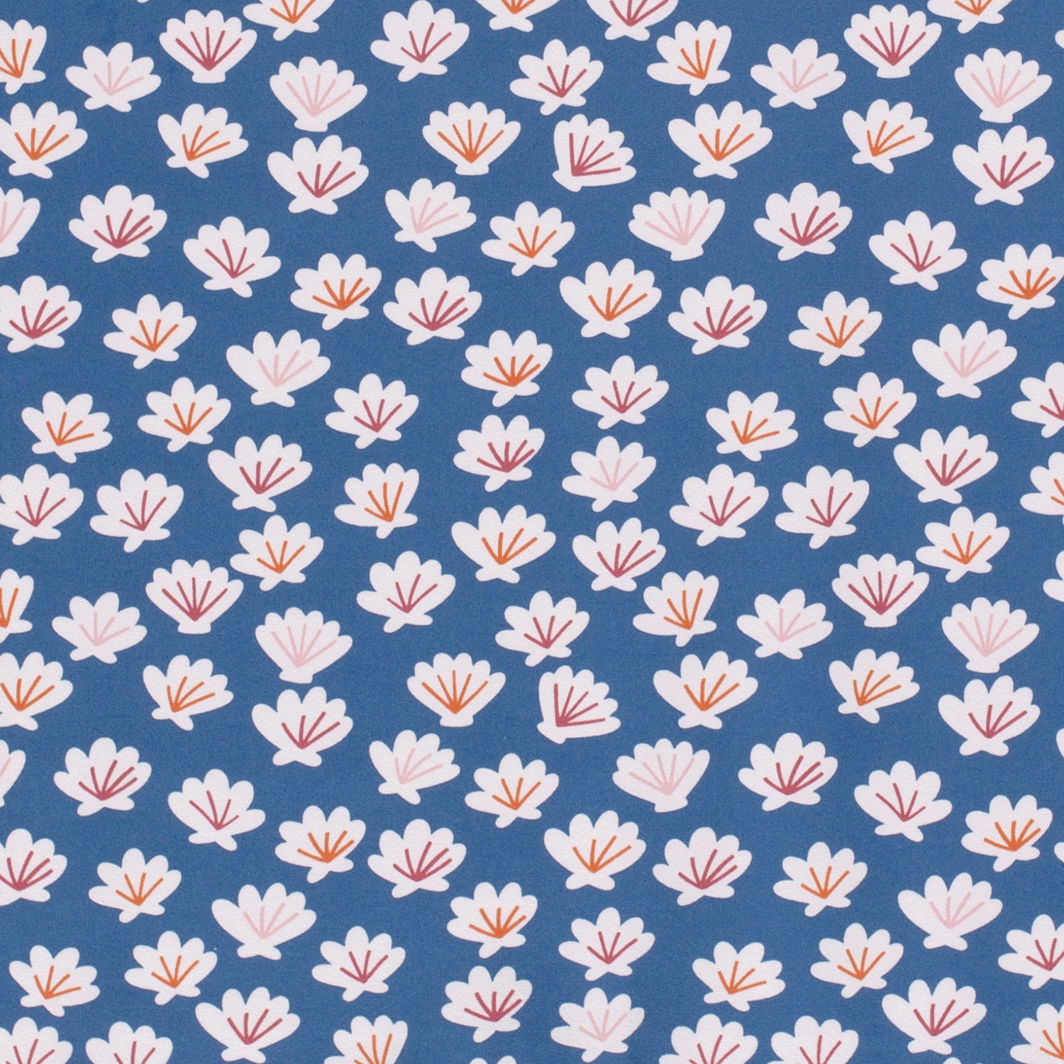 Der ruhige, blaue Hintergrund lässt die feinen Muschelformen besonders schön zur Geltung kommen und verleiht dem Stoff eine maritime, zugleich sehr entspannte Ausstrahlung. Ideal für sommerliche Shirts, luftige Kleider, bequeme Hosen, Pumphosen, Strampler oder Accessoires wie Mützen, Loops und Haarbänder – für kleine und große Meeresfans.
