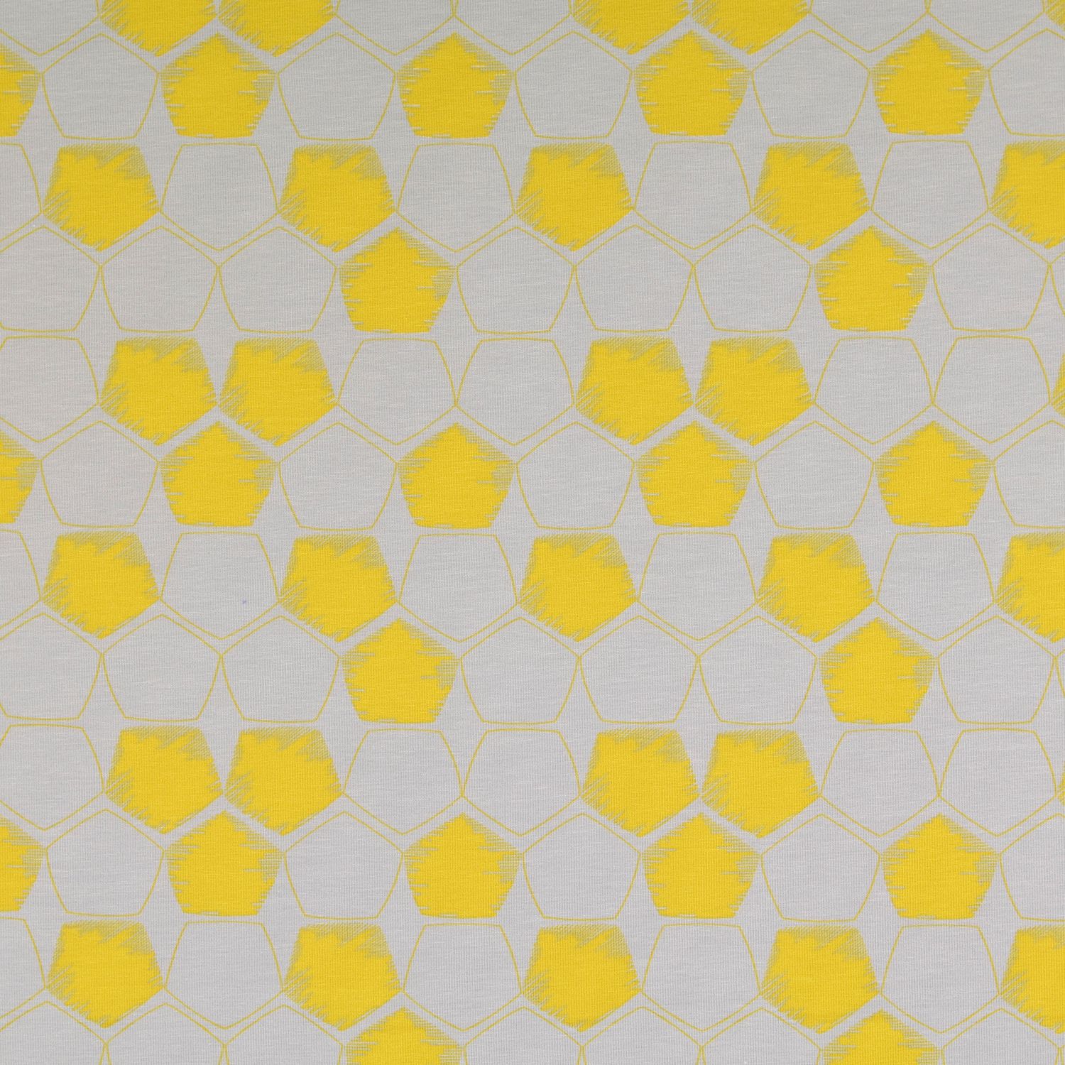 Dieser sportliche Jersey bringt Stadionfeeling direkt an die Nähmaschine: Das klassische Fußball-Pentagon-Muster zeigt sich hier modern interpretiert in frischem Gelb und kühlem Hellgrau auf weißem Grund. Die klaren Konturen der Fünfecke erinnern an den Look eines echten Fußballs und machen den Stoff zum perfekten Hingucker für kleine und große Fußballfans.
