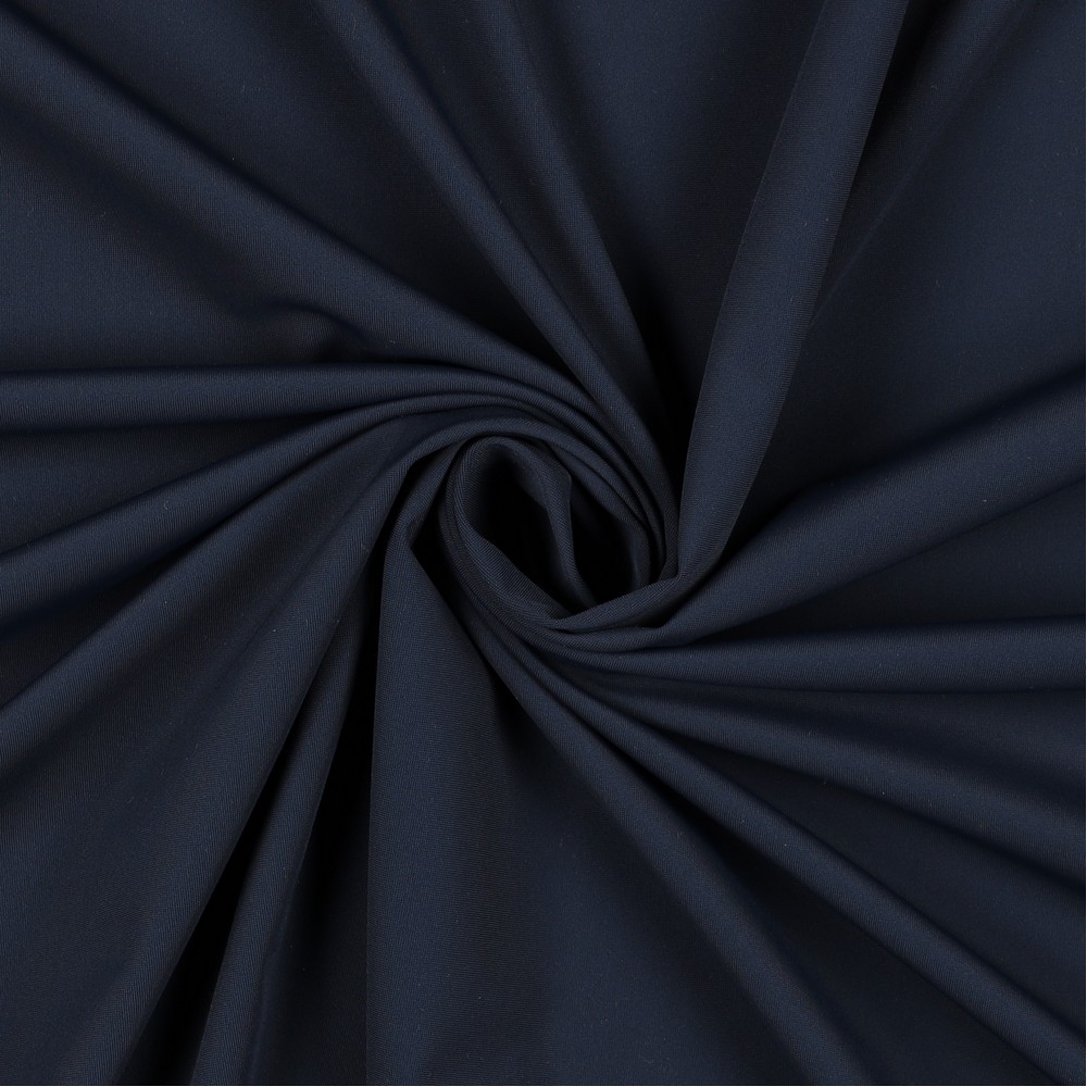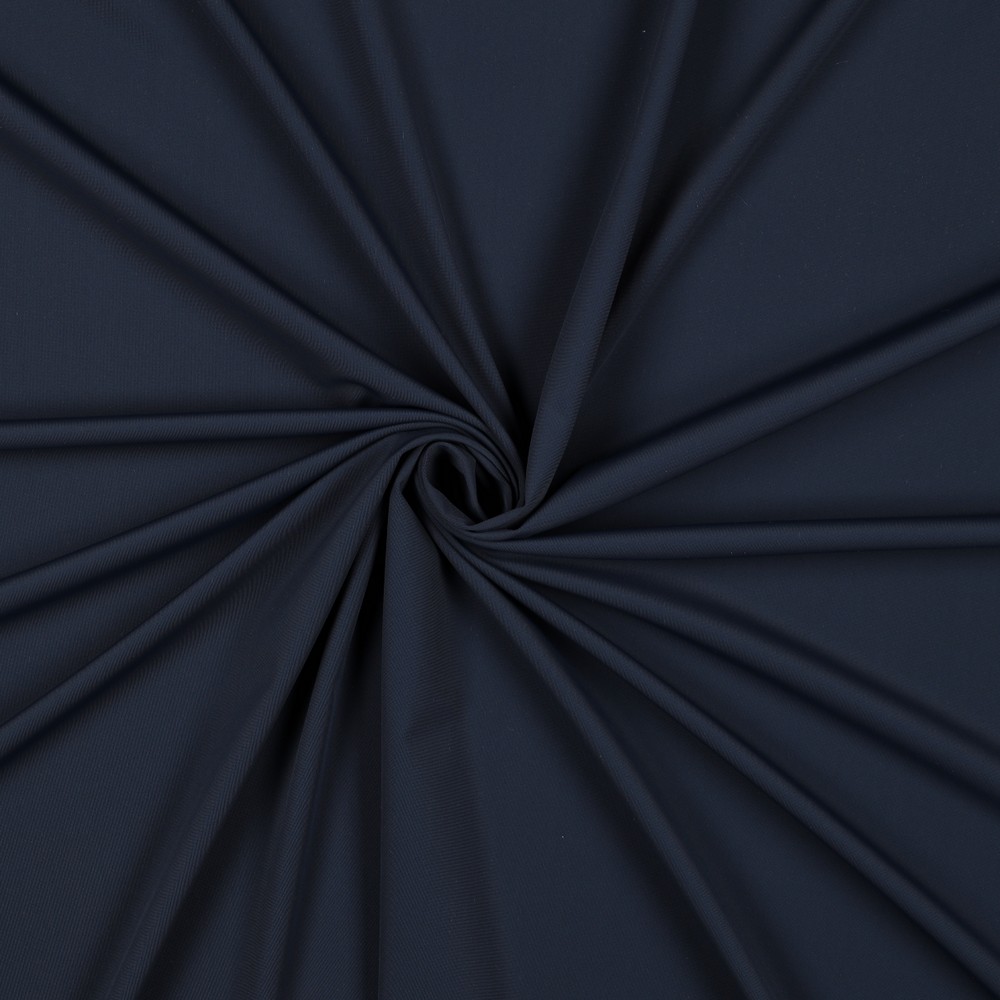 Die Oberfläche zeigt sich edel und clean: ein tiefes, sattes Dunkelblau mit leicht mattem Finish, das sehr hochwertig wirkt und sich wunderbar kombinieren lässt. Der Stoff fällt weich und fließend, ohne aufzutragen – ideal für moderne, lässige Outfits. Im Kontrast dazu wirkt die dezente, hellere Rückseite im Bild beinahe wie ein stilvolles Futter und unterstreicht den technisch-sportiven Charakter des Jerseys.