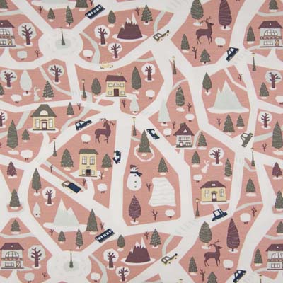 Ein verträumtes Winterdorf, sanft getaucht in Altrosa – dieser Jersey lädt zum Einkuscheln ein. Auf dem zart rosafarbenen Hintergrund reihen sich liebevoll gezeichnete Häuschen mit Spitzdächern, kleine Tannen und winterliche Details aneinander. Dezente, warme Farbtöne wie Creme, Grau und ein Hauch von Braun verleihen dem Design eine gemütliche, skandinavische Anmutung.