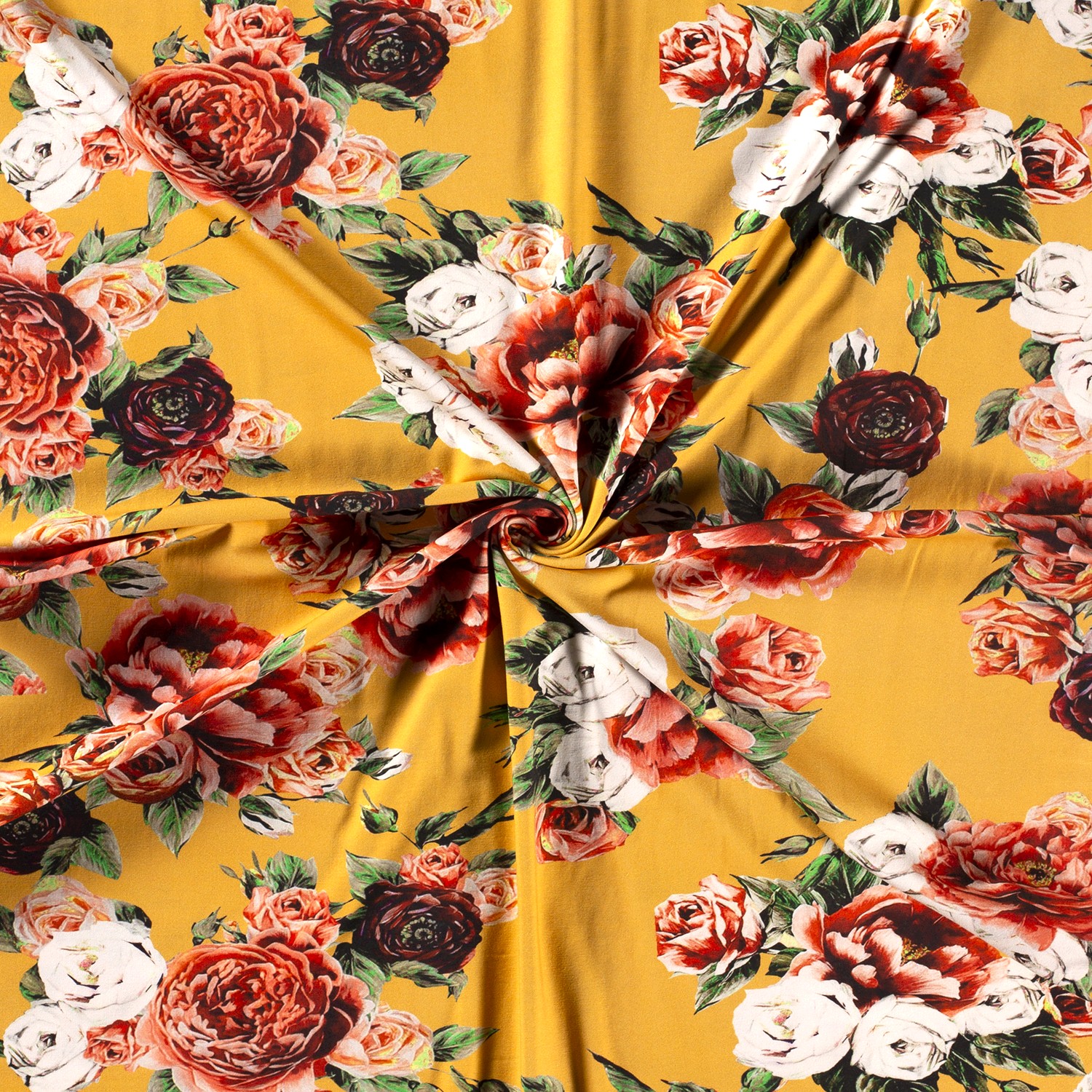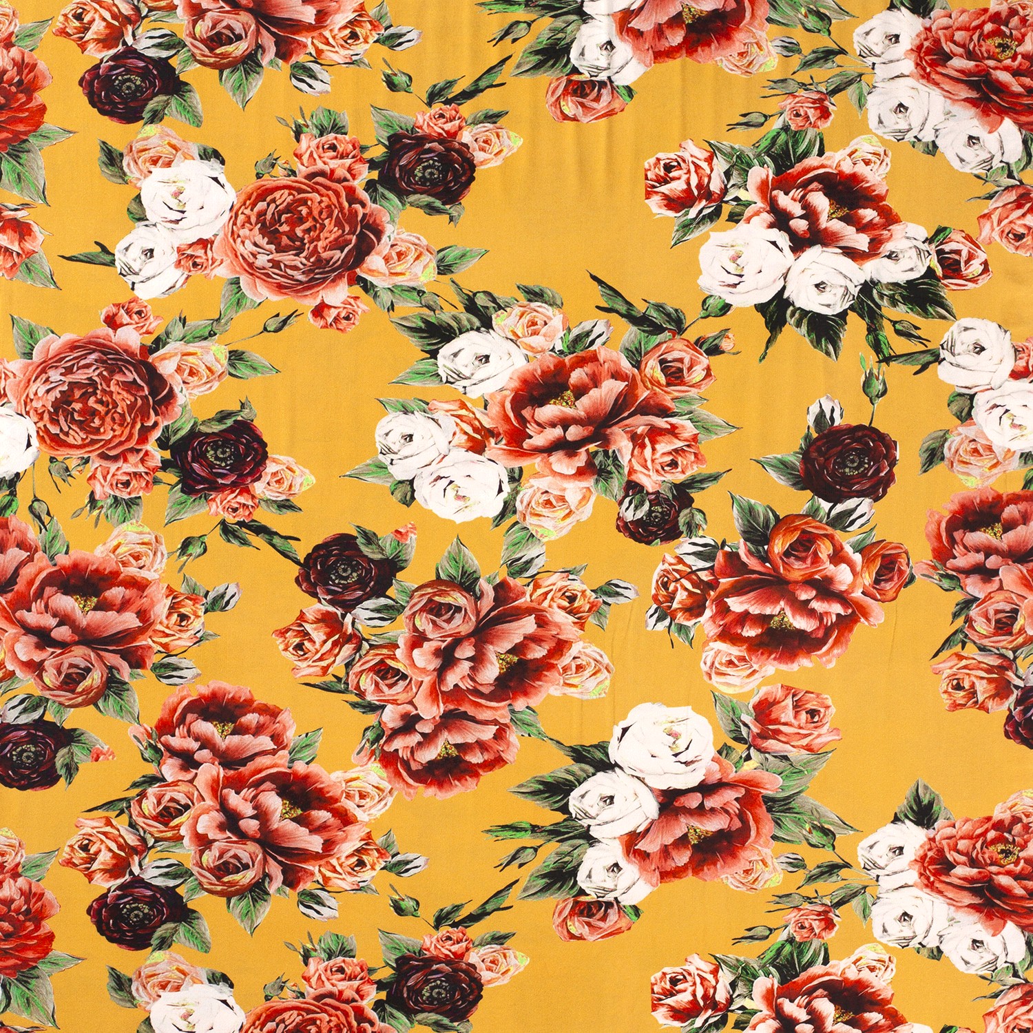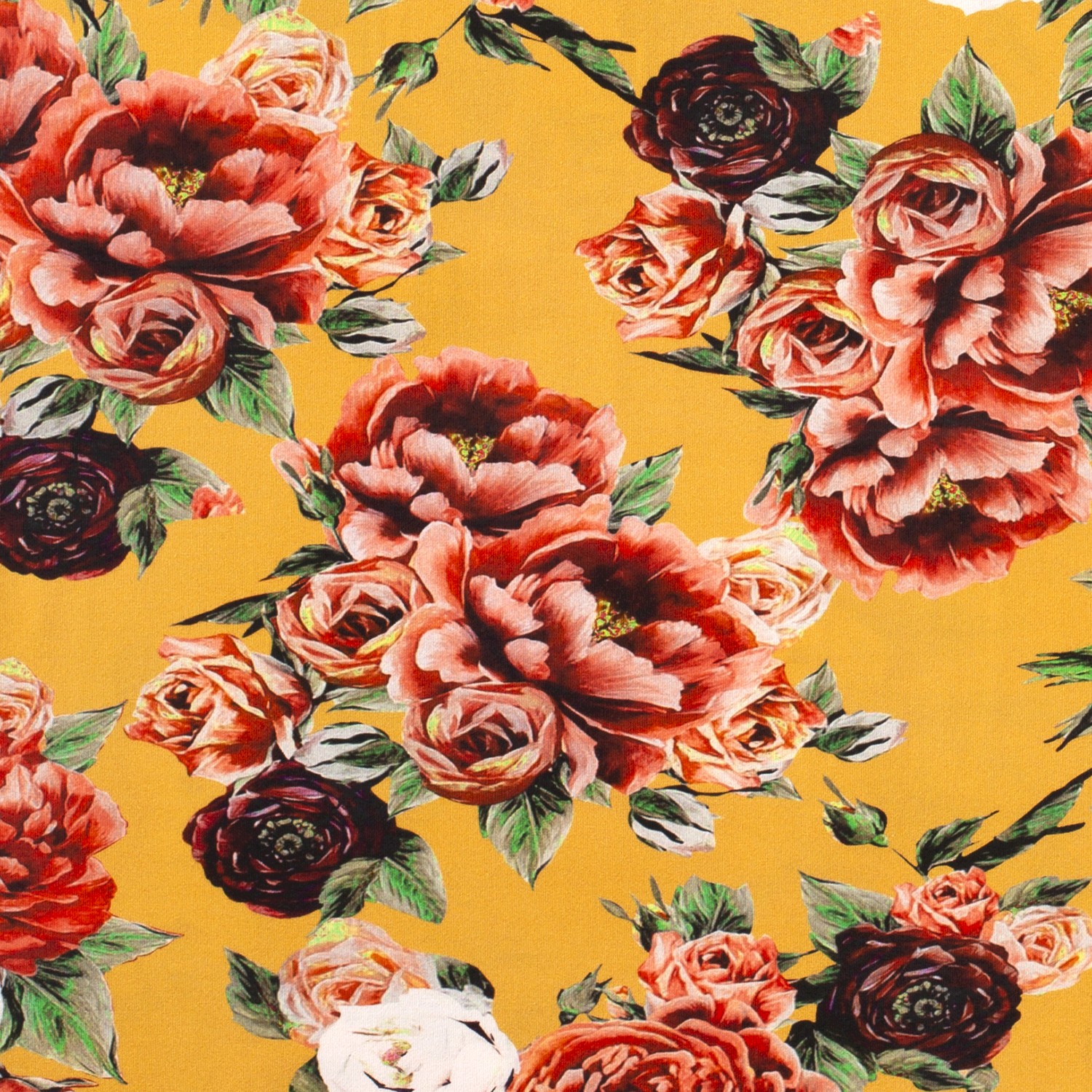 Ein Stoff wie ein Spätsommertag: Auf warmem Senfgelb erblühen große, detailreich gezeichnete Rosen in zarten Rosé- und Cremetönen, begleitet von feinen Blättern in gedecktem Grün. Die XL-Blüten wirken fast wie gemalt und kommen durch den digitalen Druck besonders klar und lebendig zur Geltung.
