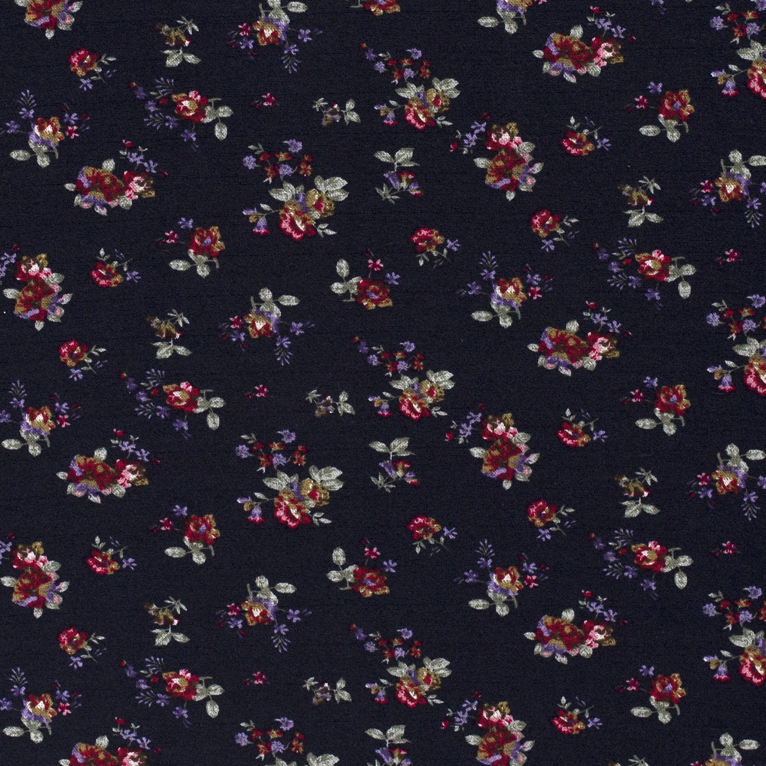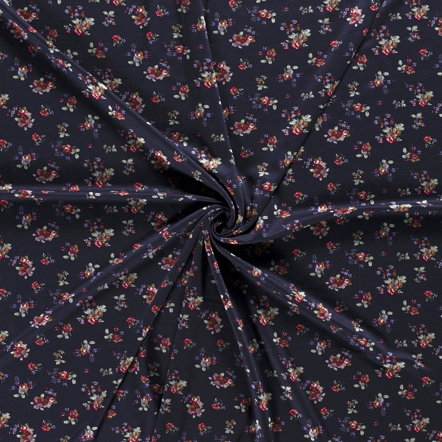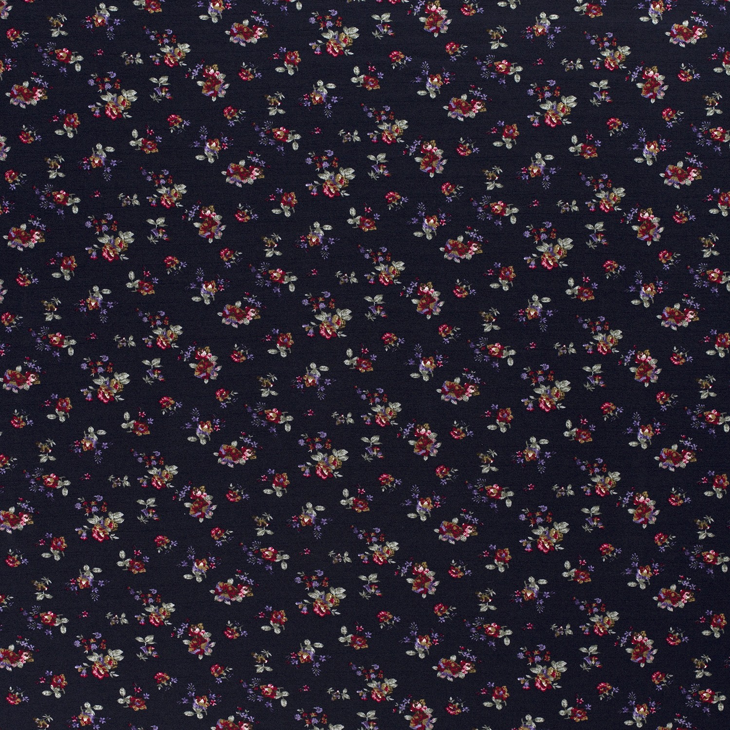 Ein zarter Blütentraum auf tiefem Navy: Dieser Modestoff verzaubert mit einem feinen Allover-Muster aus kleinen, stilisierten Blüten und Blättchen. Die Blüten in sanften Creme- und zarten Rosétönen heben sich wunderschön vom dunkelblauen Hintergrund ab und wirken gleichzeitig edel und verspielt.