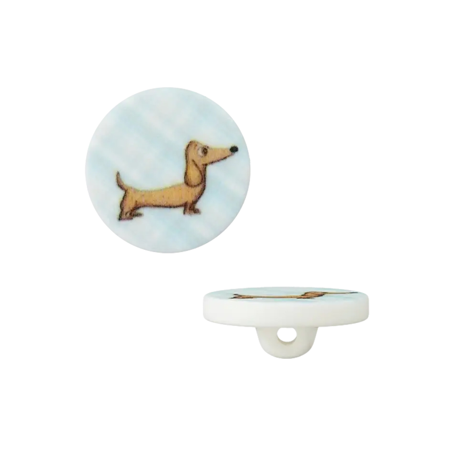 Dieser liebevoll gestaltete Knopf mit Öse bringt gute Laune in jedes Nähprojekt: Auf dem zarten, hellen Hintergrund ist ein fröhlicher Dackel in warmen Brauntönen abgebildet, der mit seinem langen Körper und der spitzen Schnauze sofort alle Blicke auf sich zieht.