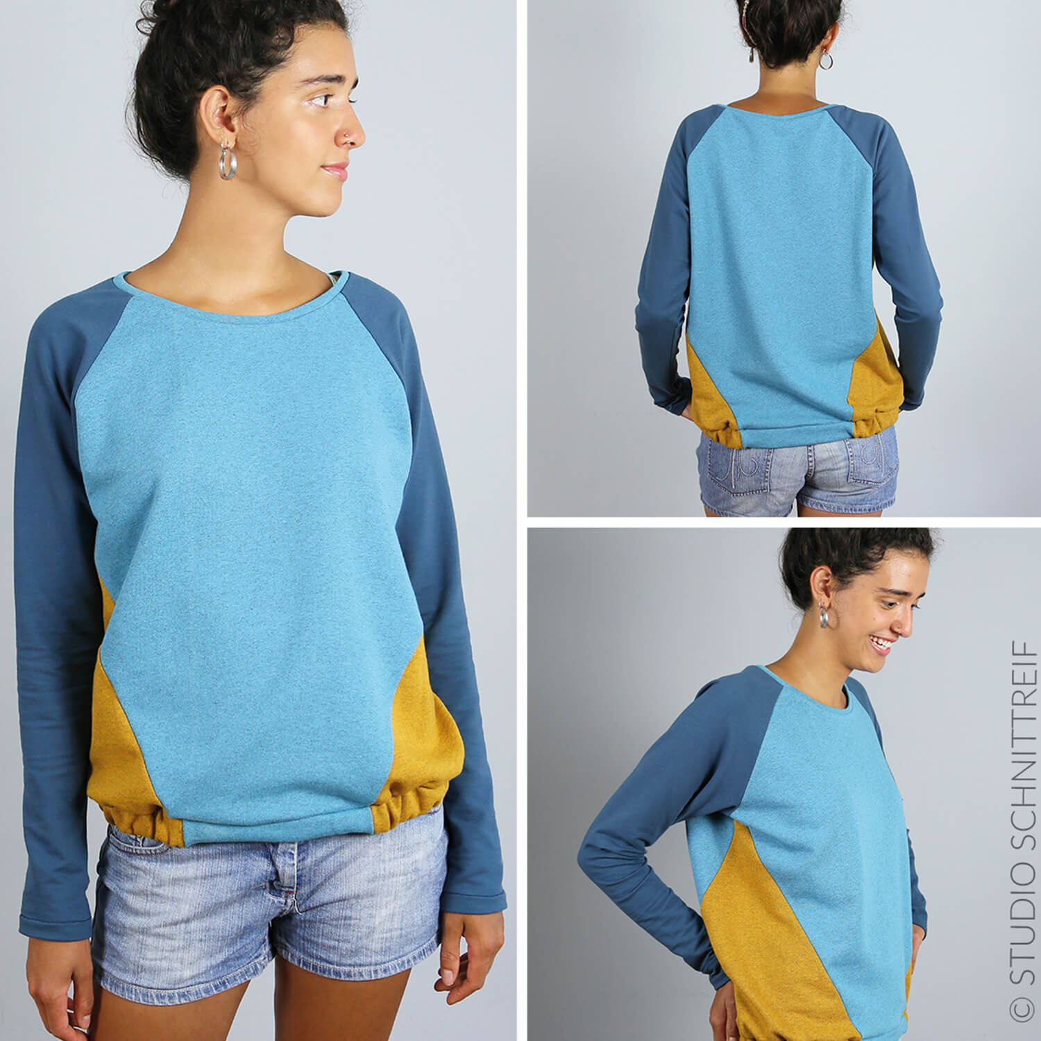Ob du mutiges Colour-Blocking mit kräftigen Kontrasten nähst, verschiedene Muster kombinierst oder dich für einen ruhigen, einfarbigen Look entscheidest – dieses Schnittmuster macht alles mit. Ideal auch, um kleinere Stoffschätze und Sweat-Reste stilvoll zu verwerten.