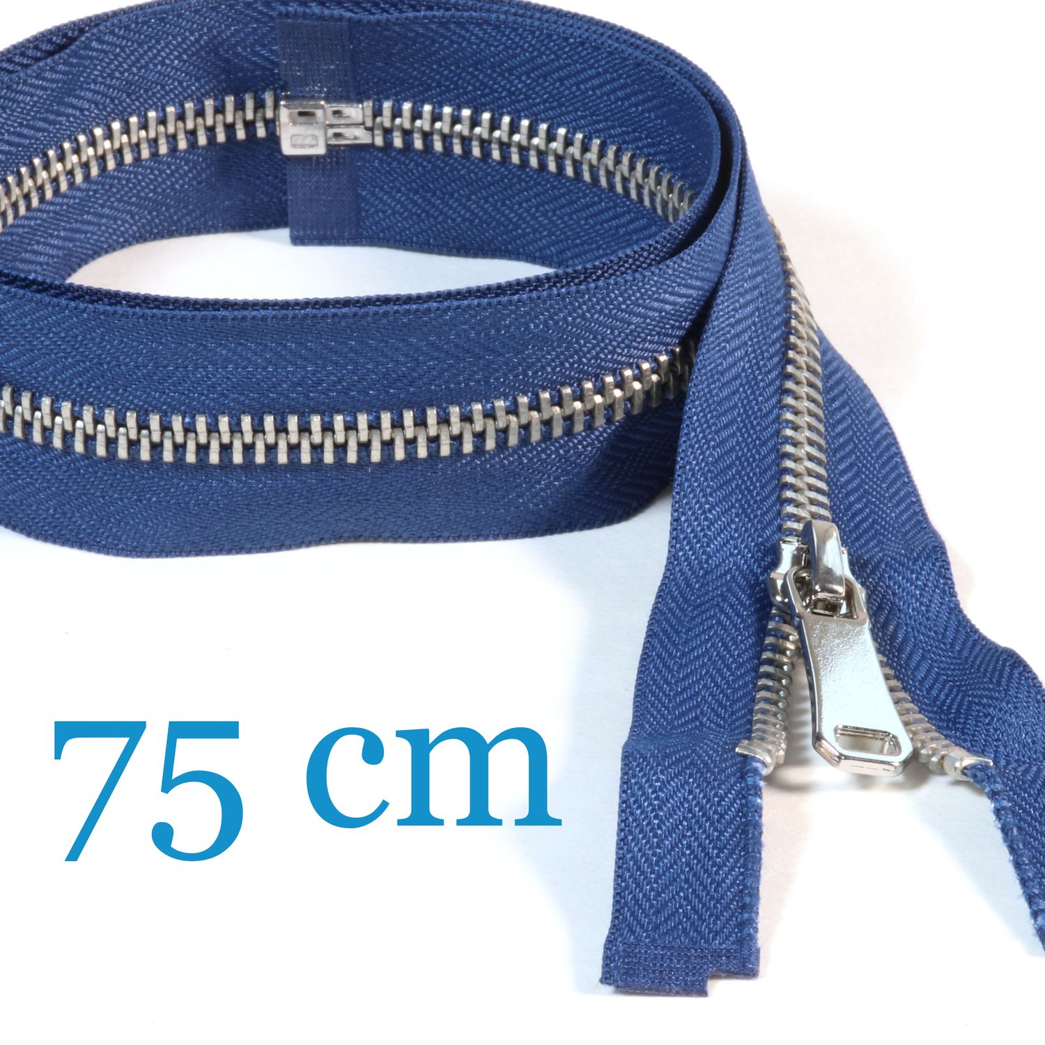 Dieser teilbare Jackenreißverschluss mit silberner Metallraupe ist ein echter Hingucker für Deine Nähprojekte. Die fein gearbeiteten, silbrig glänzenden Metallzähnchen setzen einen edlen Kontrast zum satten, dunklen Blau des Bandes und verleihen Jacken, Blousons, Westen oder Sportjacken eine hochwertige, moderne Optik.