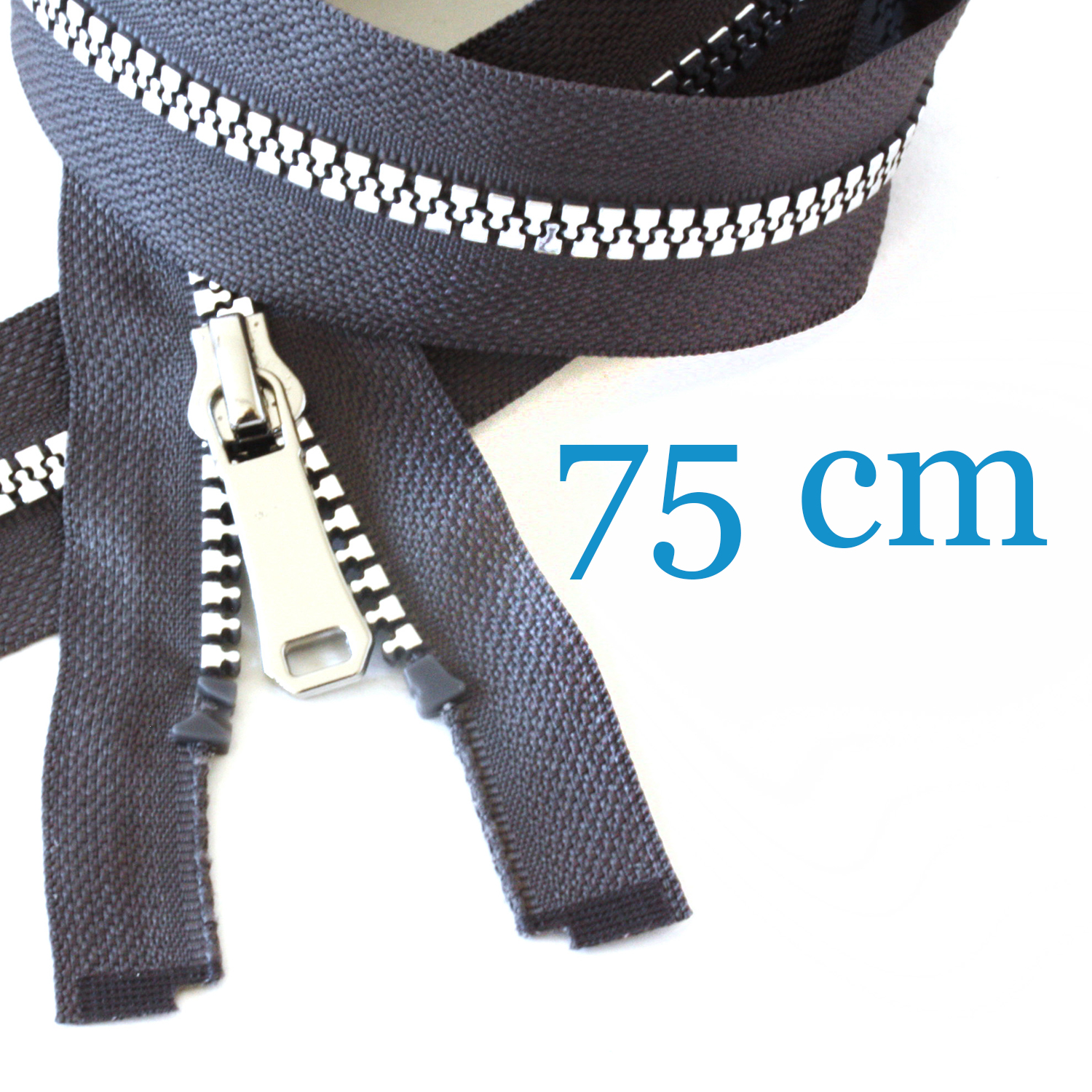 Mit seiner Länge von 75 cm eignet sich dieser Reißverschluss ideal für längere Jacken und sportliche Oberteile. Nutze ihn als bewusstes Design-Element: ob als Kontrast auf hellen Stoffen oder Ton-in-Ton auf dunklen Materialien – der silberne Glanz setzt immer ein klares, modernes Statement.
