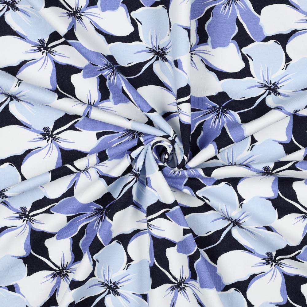 Ein kuschelig-weicher Traum in Navy: Dieser angeraute Soft Sweat verzaubert mit einem zarten Blütendesign, das wie ein feiner Blütenregen über den dunklen Hintergrund gestreut ist. Die stilisierten Blüten in hellen, harmonisch aufeinander abgestimmten Tönen setzen einen wunderschönen Kontrast zum tiefen Blau und lassen den Stoff gleichzeitig edel und verspielt wirken.