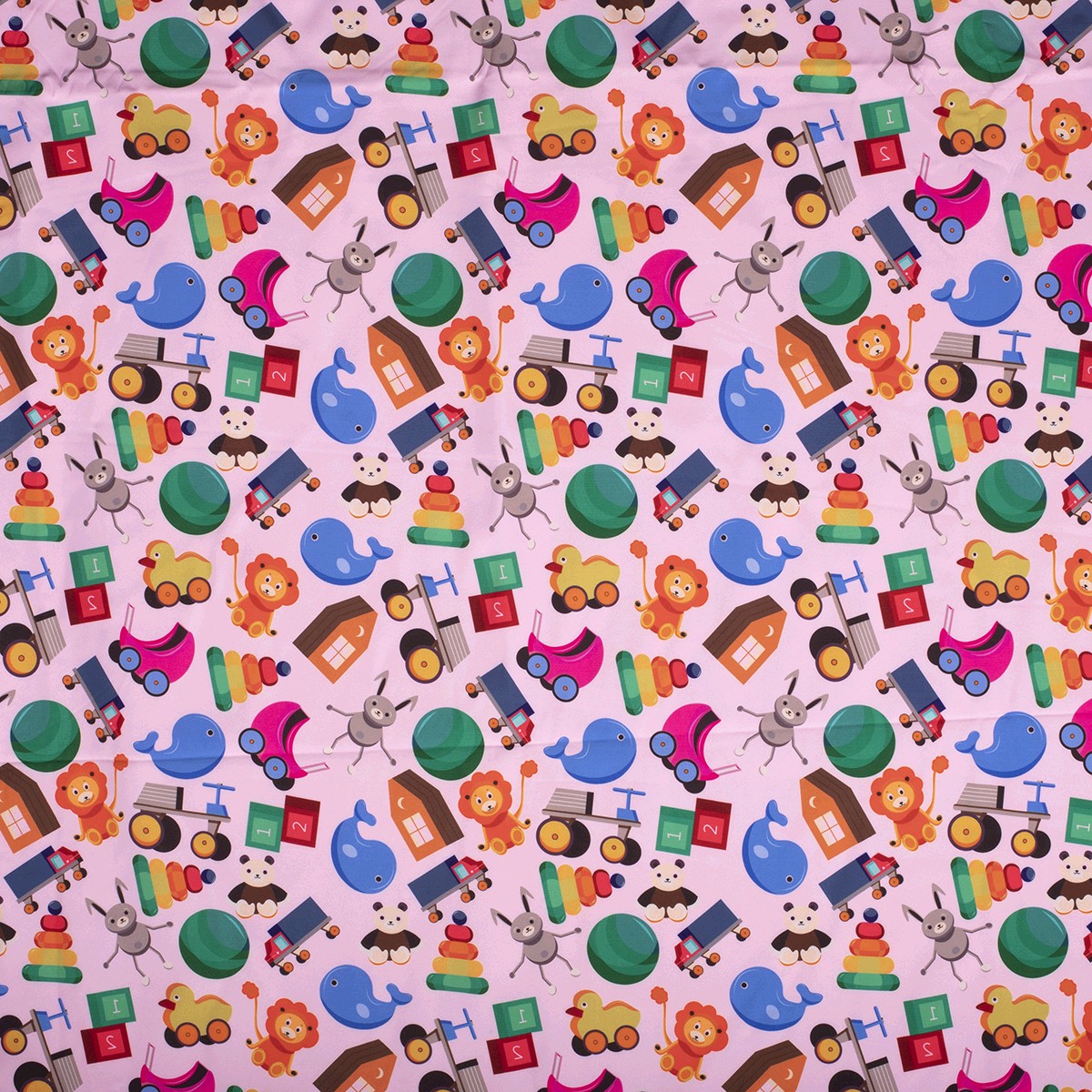 Dieser zauberhafte Softshell in Hellrosa bringt Kinderaugen zum Leuchten: Auf dem sanften Pastellgrund tummeln sich liebevoll gestaltete Spielsachen – kleine Züge, Kinderwagen, Häuschen und mehr – in fröhlichen, klaren Farben. Das moderne Digitaldruck-Design wirkt dabei besonders lebendig und detailreich, ohne zu bunt zu sein.