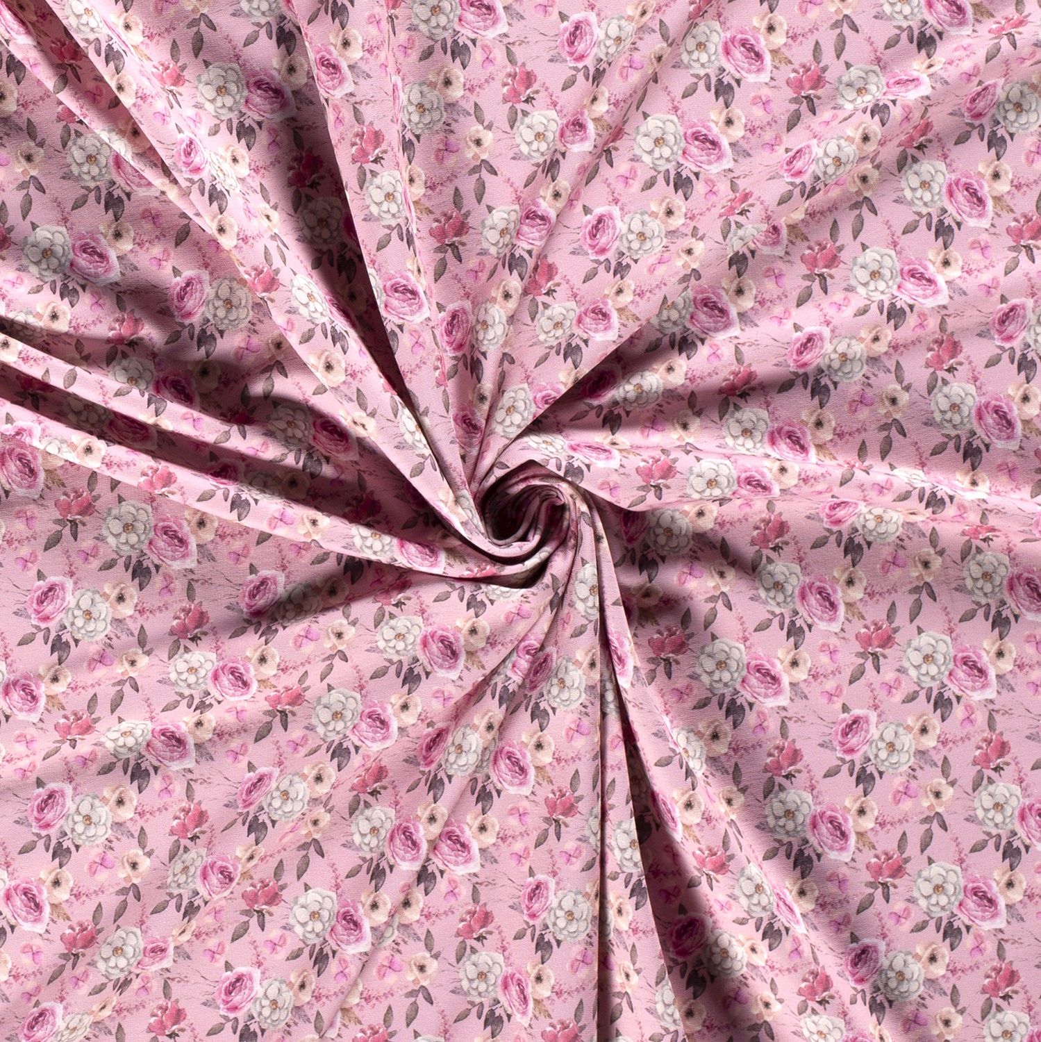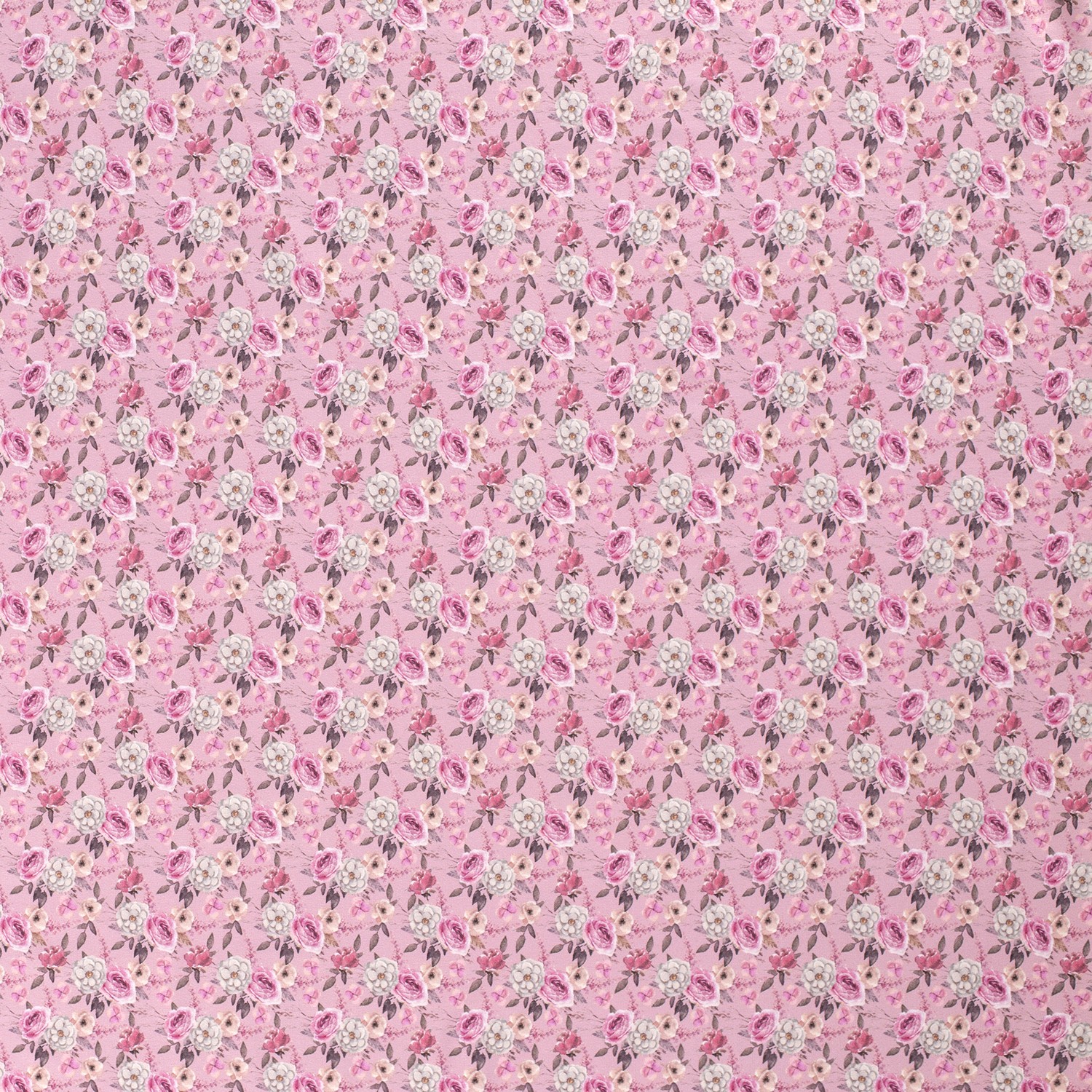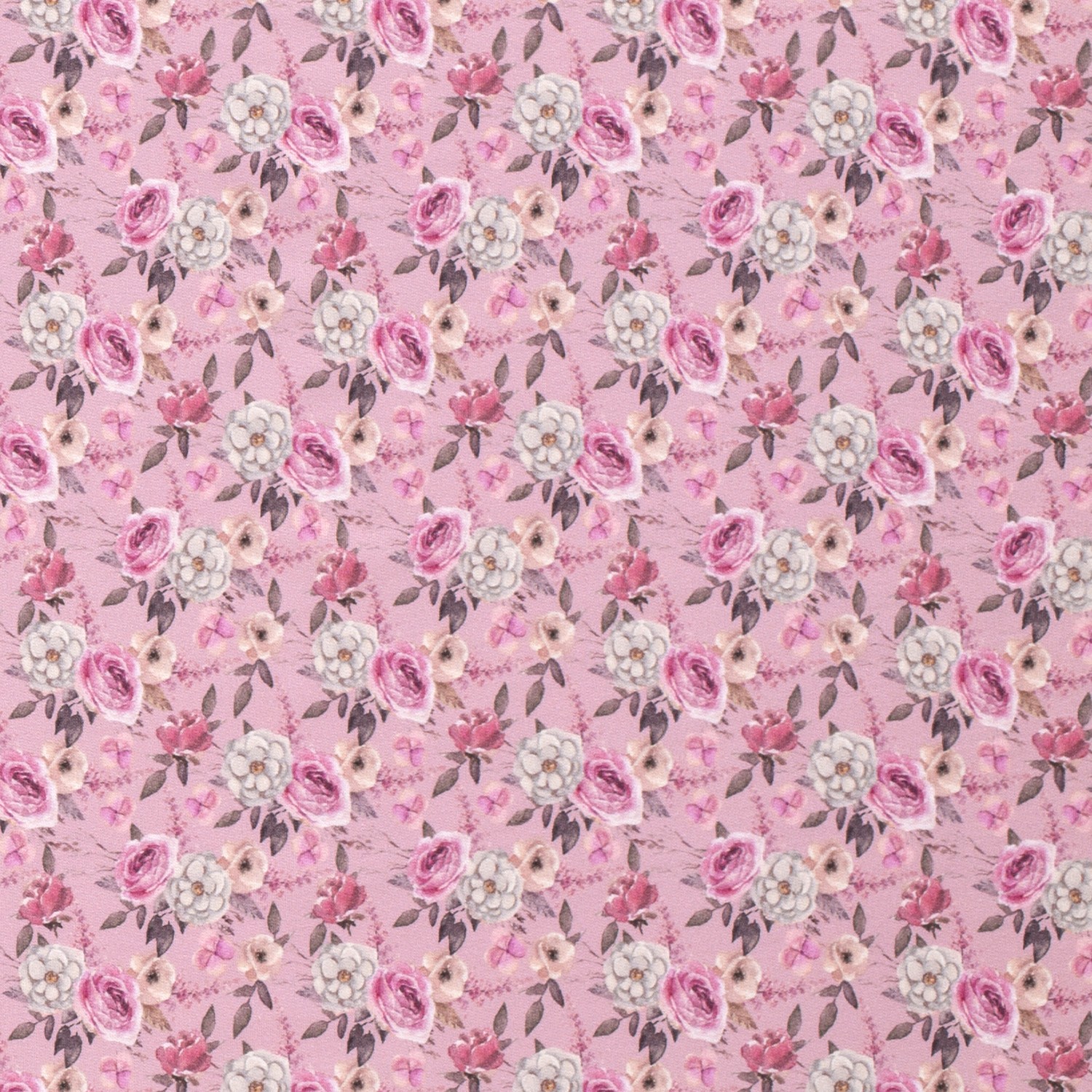 Zarte wilde Rosen, kleine Blüten und feine Blätter ranken sich in harmonischen Naturtönen über einen sanft altrosa Hintergrund – wie ein romantischer Blumengarten auf Stoff. Die detailreiche, digitale Musterung lässt jede Rose lebendig wirken und verleiht deinen Nähprojekten eine feminine, verspielte Note.