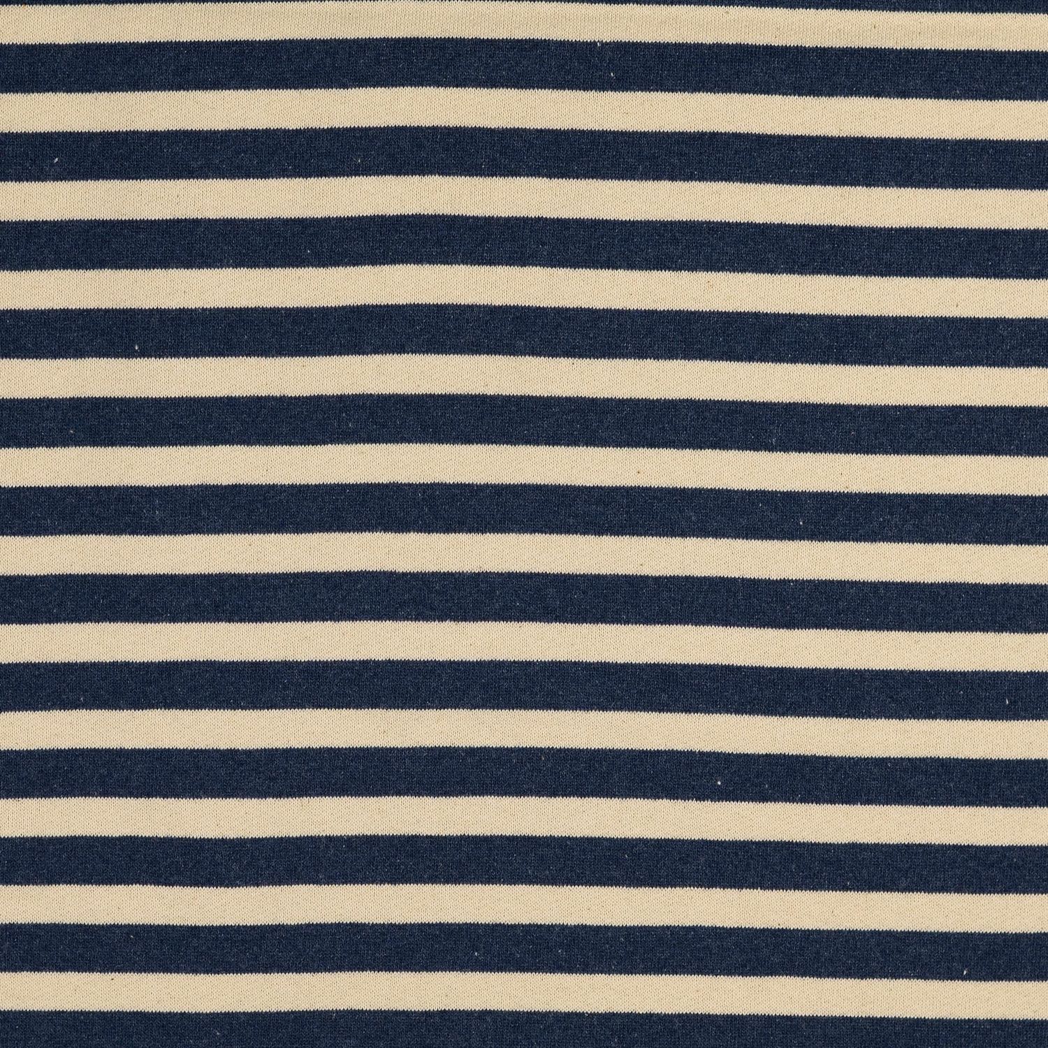 Lässiger Streifen-Sweat im angesagten Vintage-Look: Tiefes Jeansblau trifft auf warmes Ecru in klaren, ca. 10 mm breiten Blockstreifen. Die angeraute Innenseite macht den Stoff wunderbar weich und kuschelig, während die Außenseite mit ihrer leicht unregelmäßigen, „verwaschenen“ Optik an ein liebgewonnenes Lieblingsstück erinnert.