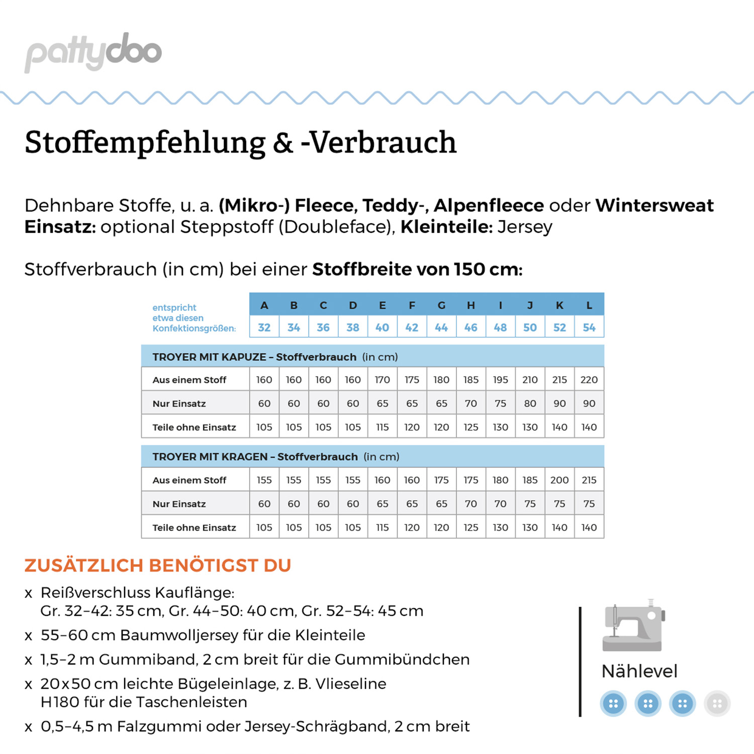 Die praktischen Leistentaschen fügen sich dezent ins Design ein und bieten Platz für Handy, Schlüssel oder einfach warme Hände beim Spaziergang. Für kleinere Details wie Belege oder Innenkapuze kannst du wunderbar elastische Stoffe wie Jersey oder Sweat einsetzen. Am Saum entscheidest du selbst: Entweder ein sportlicher Abschluss mit Gummizug für den Outdoor-Look oder ein bequemes Bündchen – auf Wunsch mit Daumenloch für extra Kuschelfaktor. Hierfür eignet sich besonders formstabile Bündchenware.