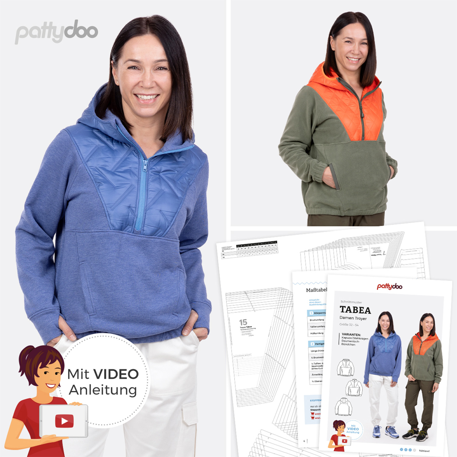Der Schnittbogen umfasst die Größen 32 bis 54 und wird von einem ausführlichen Booklet mit Maßtabellen, Zuschnittplänen und Tipps zur Größenanpassung begleitet. Zusätzlich führt dich eine kostenlose YouTube-Videoanleitung Schritt für Schritt durch das komplette Nähprojekt – ideal, wenn du dir beim Nähen noch etwas Unterstützung wünschst. So entsteht ein vielseitiger Pullover, den du immer wieder neu interpretieren kannst und der dich zuverlässig warm und stilvoll durch das ganze Jahr begleitet.