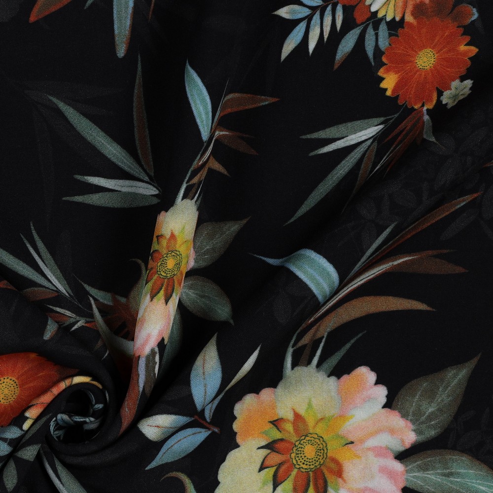 Der dunkle Hintergrund lässt die floralen Motive intensiv strahlen und verleiht dem Design eine stilvolle, leicht geheimnisvolle Note. Ob feminine Blusen, fließende Kleider, Röcke oder Tunikas – dieser Stoff bringt einen Hauch von Eleganz und Romantik in deine Garderobe.