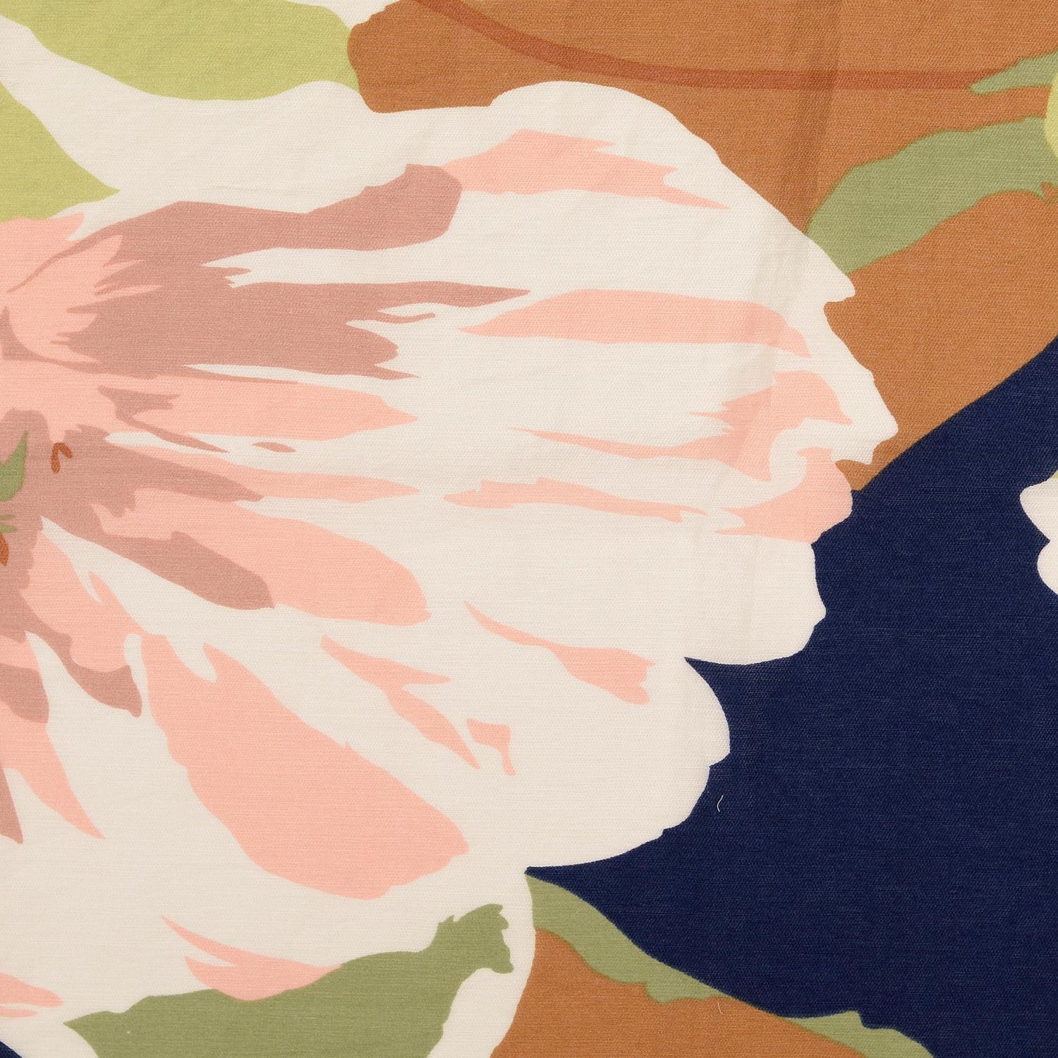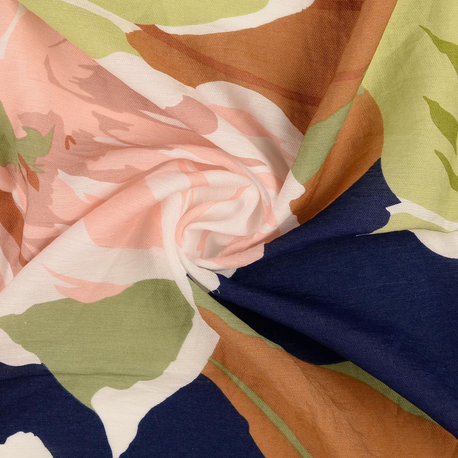 Ein Stoff wie ein sommerlicher Spaziergang durch einen üppigen Garten: Auf sattem Grün erblühen große, detailreich gestaltete Blumen in leuchtenden Multicolor-Nuancen. Zarte Rosé- und Pinktöne treffen auf warme Gelb- und Orangeschattierungen, ergänzt durch feine Blätter und Akzente in gedeckten Naturtönen.