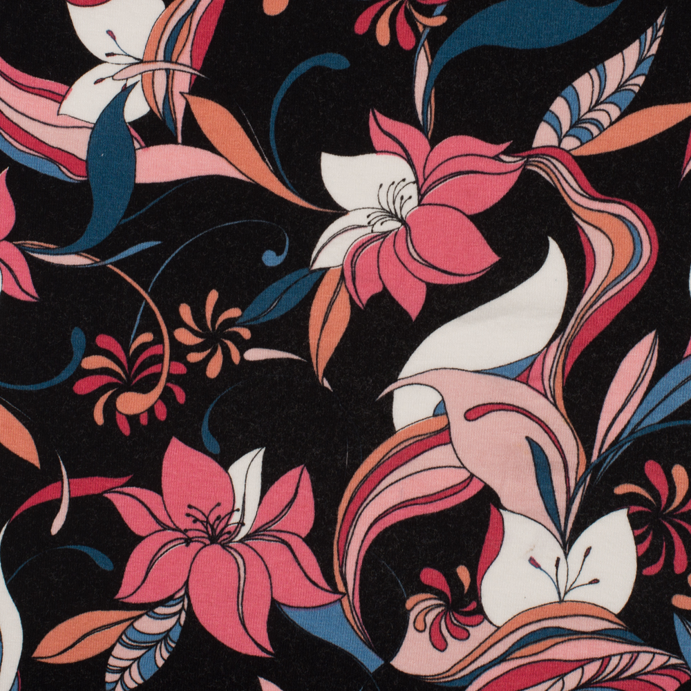 Eleganter, fließender Jersey mit edlem Blumenprint auf tiefschwarzem Hintergrund. Zarte Blüten in warmen Rosé- und Beigetönen treffen auf feine Blätter in gedecktem Grün und Creme – ein harmonisches, feminines Dessin, das sowohl alltagstauglich als auch besonders wirkt.