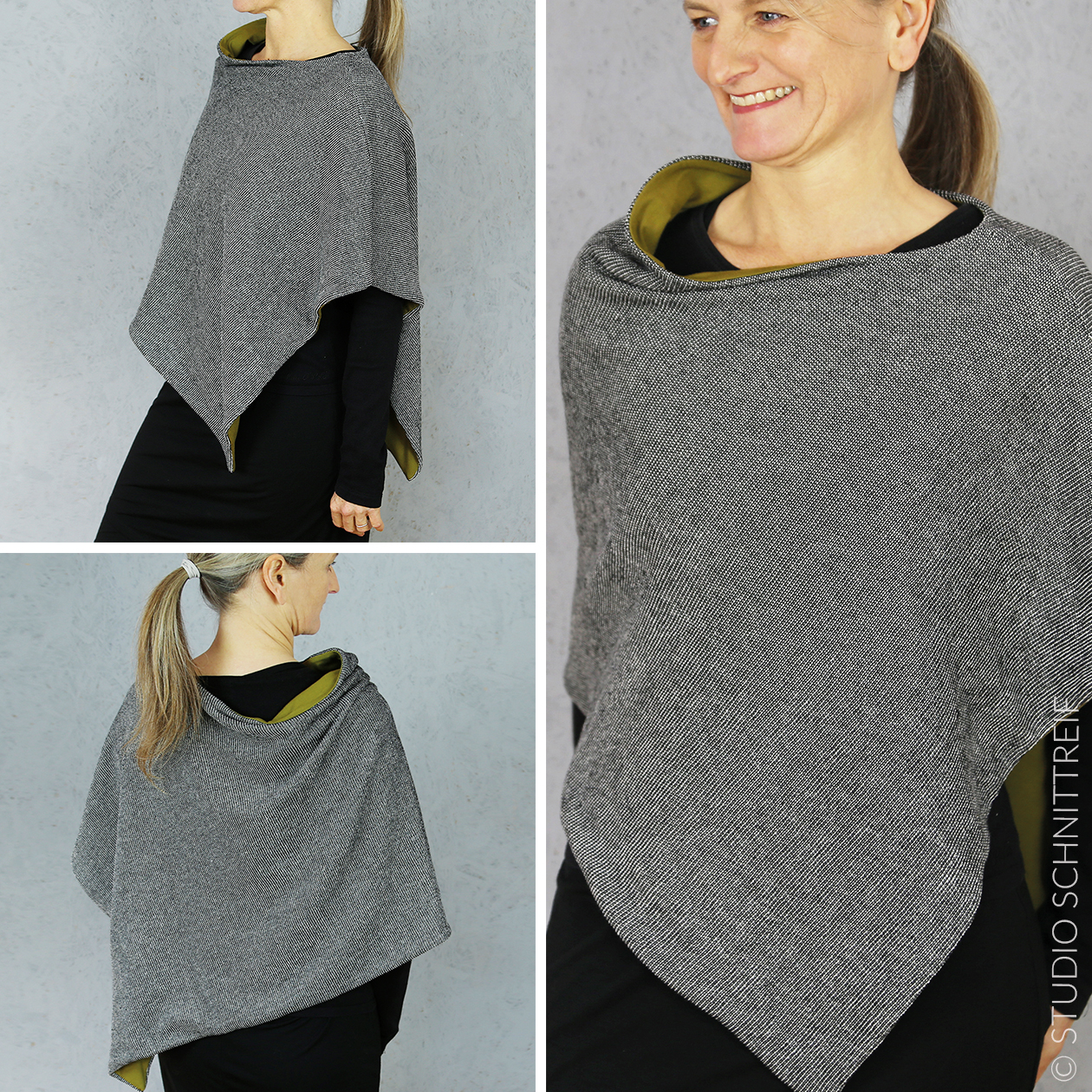 Das Besondere: Der Poncho ist beidseitig tragbar. Du kannst mit zwei verschiedenen Stoffseiten spielen – zum Beispiel eine schlichte, ruhige Seite und eine gemusterte oder farbige Seite, die beim Tragen frech hervorblitzt. So entsteht im Handumdrehen ein wandelbarer Look, der zu Jeans, Kleid oder Rock passt.